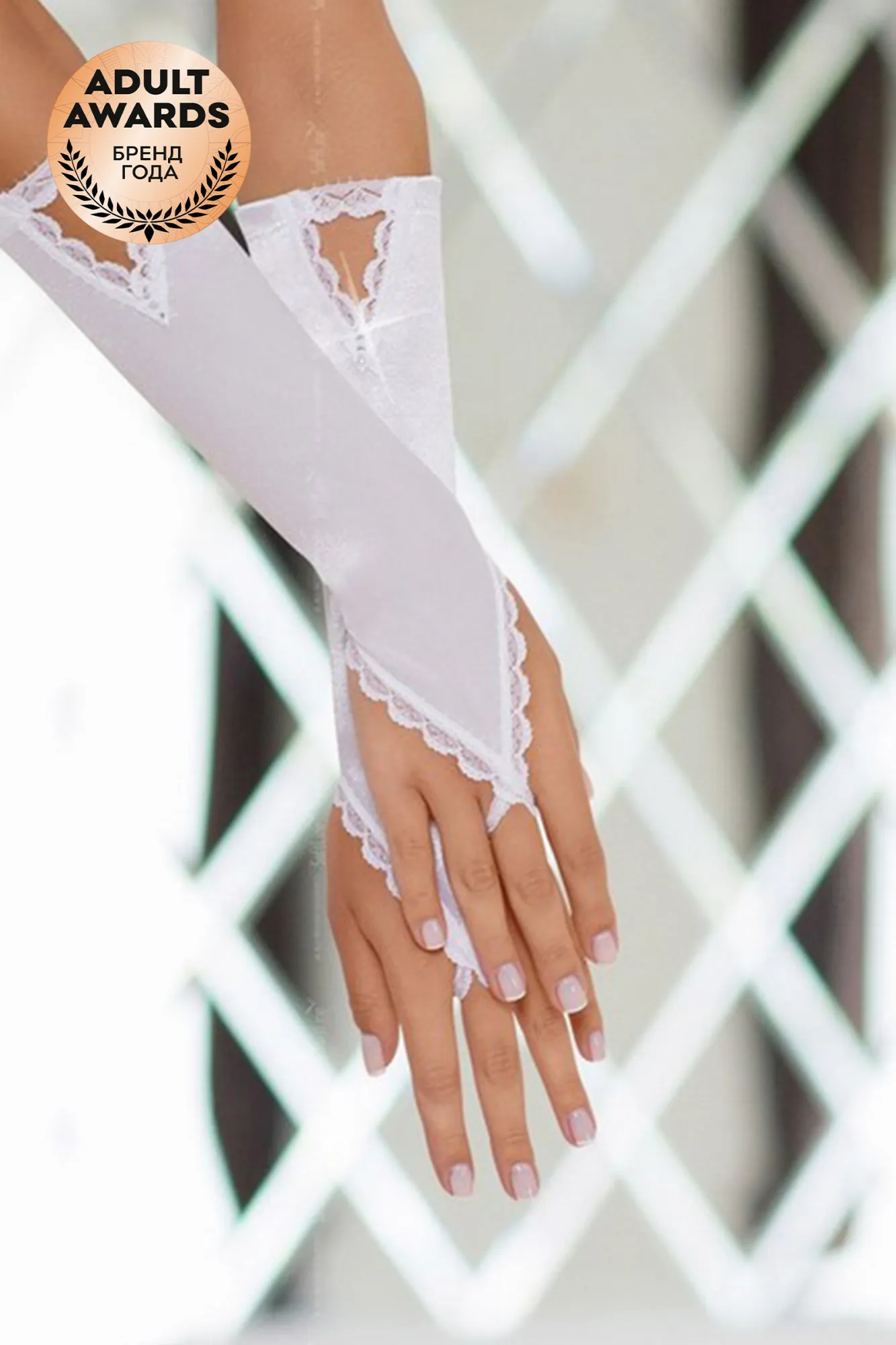 Перчатки атласные, украшенные стразами и кружевными элементами декора. Вырезы в виде треугольников у основания.