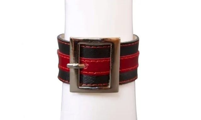 Данный браслет - это изысканный аксессуар, который отлично подойдет как дополнение к эротическому костюму. Его можно носить и в повседневной жизни, подчеркнув тем самым свой дерзкий стиль. Браслет выполнен из натуральной кожи черного и красного цветов и украшен квадратной пряжкой. Размер универсальный.