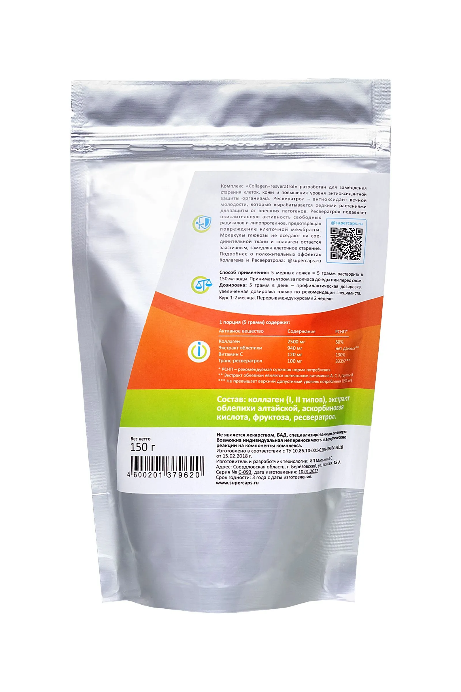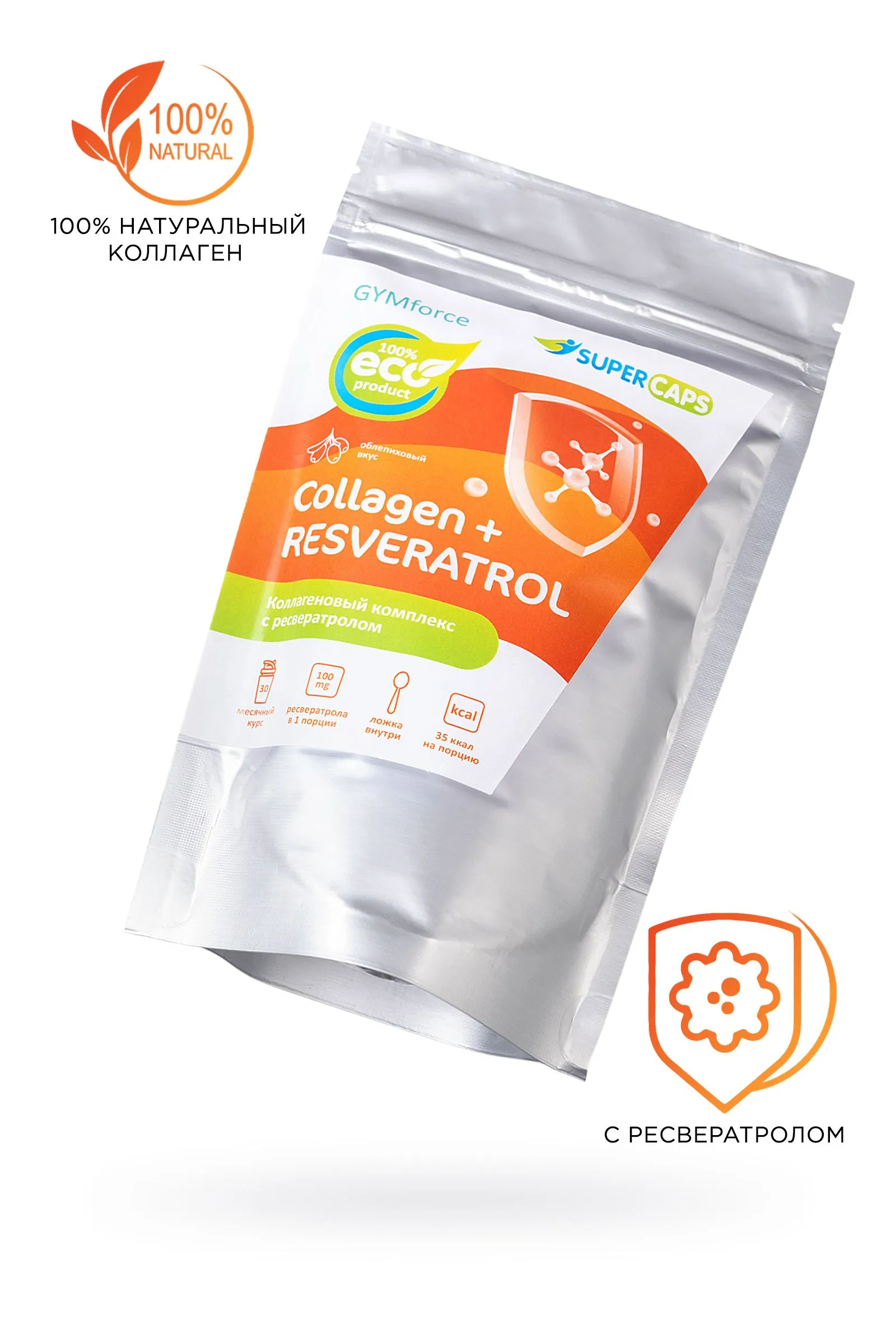 Collagen+resveratrol – новейший beauty-продукт для замедления старения клеток организма и кожи и повышения уровня антиоксидантной защиты организма. Коллаген – фибриллярный белок человеческого организма, который составляет основную часть соединительной ткани. Он является структурным элементом мышц, суставов, кожи. К сожалению с возрастом выработка коллагена в организме снижается, поэтому SuperCups разработал линейку продуктов из коллагена для поддержания здоровья организма. Комплекс Collagen+resveratrol обогащен ресвератролом - природным антиоксидантом вечной молодости, который вырабатывается растениями для защиты от внешних патогенов. В природе встречается крайне редко, больше всего в кожуре красного винограда. Ресвератрол: подавляет окислительную активность свободных радикалов и липопротеинов предотвращает повреждение клеточной мембраны помогает коллагену оставаться эластичным и замедляет старение на клеточном уровне. Продукт содержит 100% натуральный коллаген премиального качества, добытый из морепродуктов и рыб. Морской коллаген наиболее близок по структуре к человеческому коллагену, поэтому имеет самую высокую усвояемость организмом. Комплекс из морского коллагена, усиленный витамином С (экстракт алтайского шиповника), обладает общим омолаживающим эффектом, укрепляет суставы, улучшает состояние волос и ногтей, является белковым питанием для кожи и мышц. Способ применения: 5 мерных ложек = 5 грамм. Растворить в 150 мл воды. Принимать утром, за полчаса до еды. Дозировка: 5 грамм – в профилактических целях, увеличенная дозировка только по рекомендации специалиста. Курс 1-2 месяца. Перерыв между курсами 2 недели. 1 порция (5 грамм) содержит: Коллаген - 2500 мг Экстракт облепихи - 940 мг Витамин С - 120 мг Транс-ресвератрол - 100 мг Калорийность 1 порции - 35 ккал. Состав: Гидролизованный коллаген (I,II типов), экстракт облепихи алтайской, аскорбиновая кислота, фруктоза, транс-ресвератрол. Не является лекарством, БАД. Возможна индивидуальная непереносимость и аллергические реакции на компоненты комплекса.