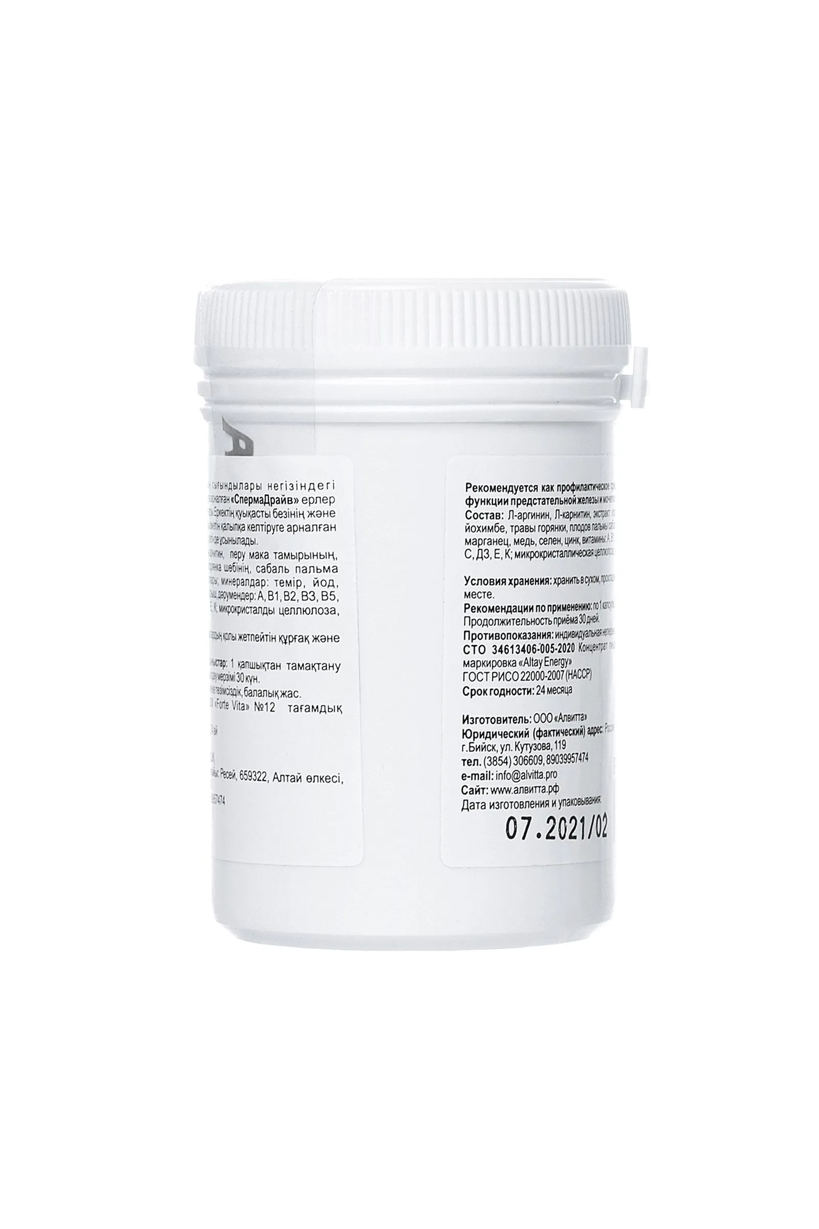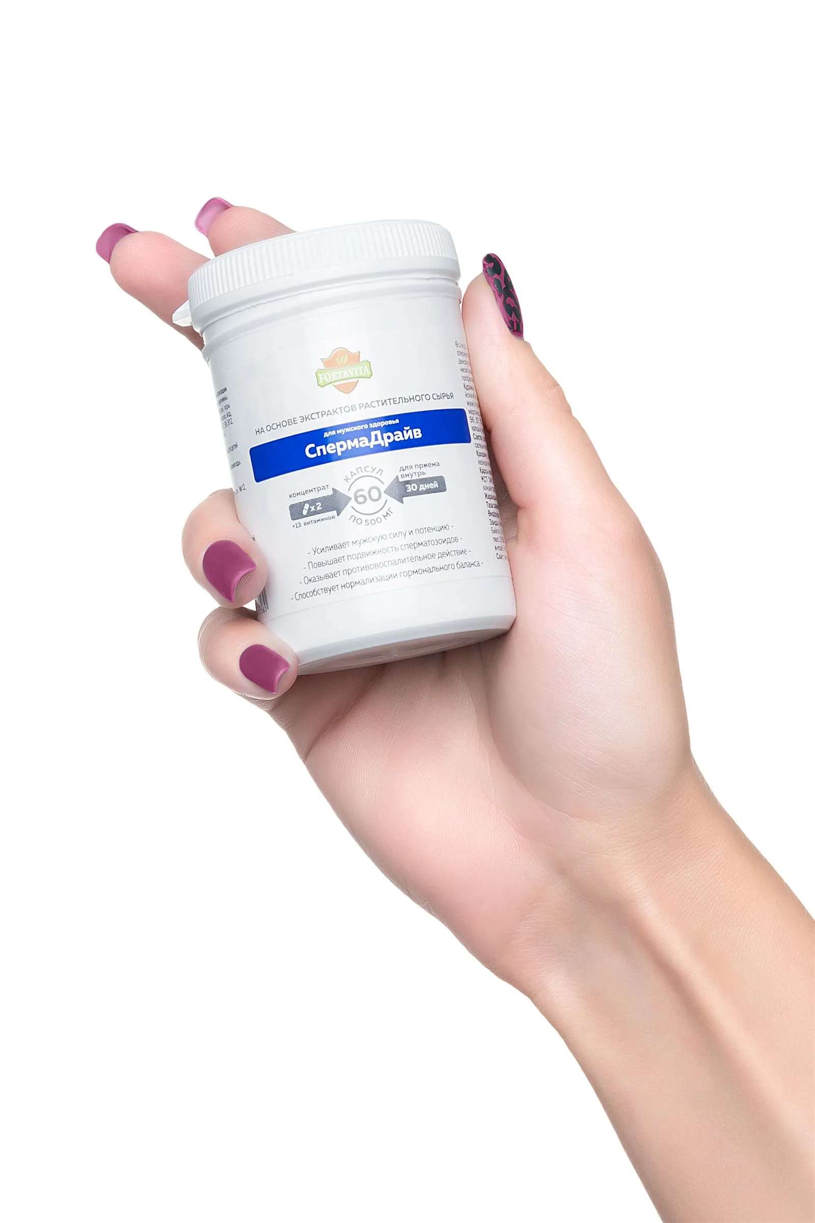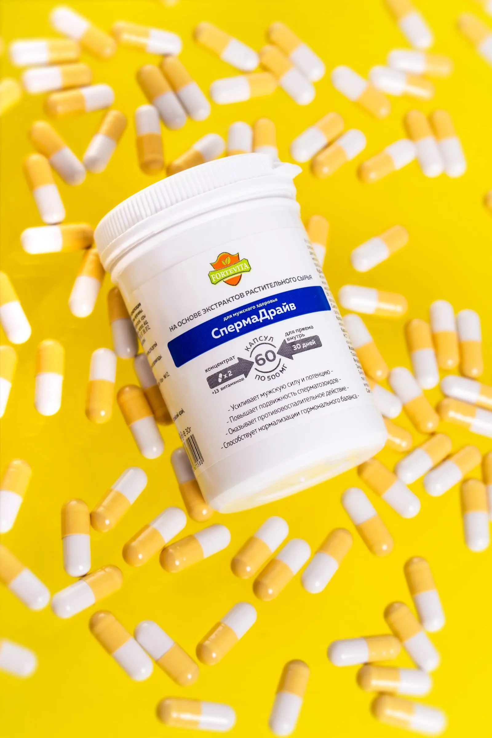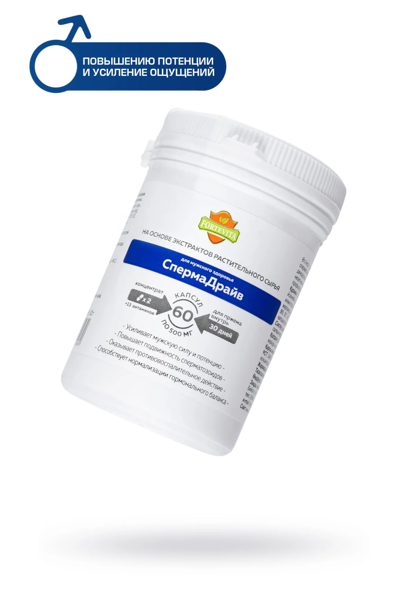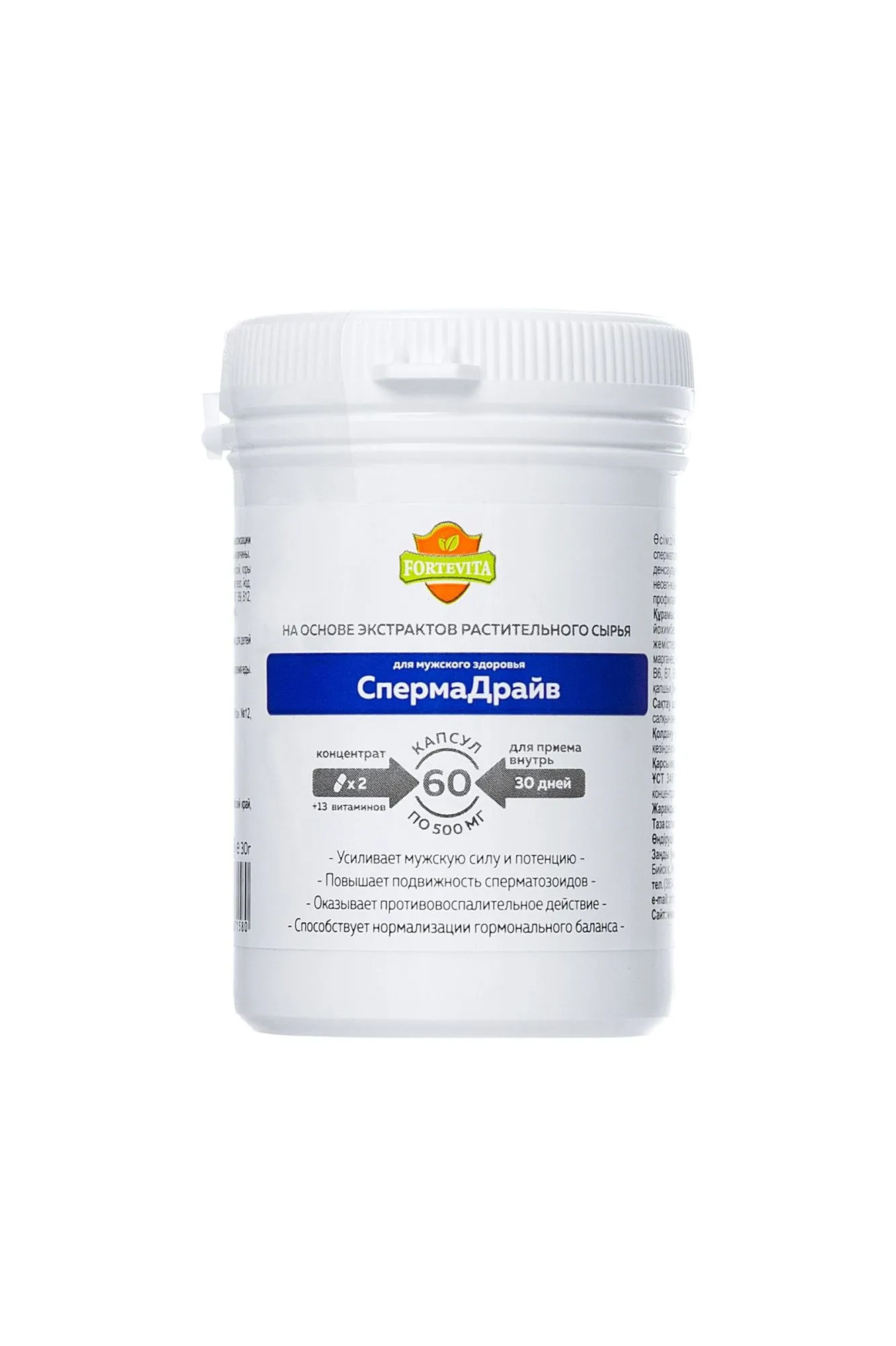 «ForteVita» МУЖСКОЕ ЗДОРОВЬЕ «СПЕРМАДРАЙВ» 60 капсул по 500 мг Сила и уверенность в завтрашнем дне – вот что важно мужчине, чтобы жить полноценной и насыщенной жизнью. Жизненно необходимо оставаться энергичным и активным представителем сильного пола. Поддерживать и улучшать способность удовлетворять любые сексуальные желания и оставаться сексуально активным мужчиной помогает биологически-активная добавка ForteVita Мужское здоровье “Спермадрайв”. Сбалансированное сочетание целебных трав и экстрактов растений-афродизиаков способствует выработке тестостерона и повышению потенции, дополняя усилением ощущений и продолжительностью полового акта. Концентрат из плодов трибулуса, корня маки перуанской, коры йохимбе, травы горянки, плодов пальмы сабаль оказывает противовоспалительное, общеукрепляющее действие, предупреждая развитие грибковой инфекции органов мочеполовой системы. Минералы - железо, йод, марганец, медь, селен, цинк, витамины – А, В1, В2, В3, В5, В6, В7, В9, В12, С, Д3, Е, К – поддерживают половую и нервную систему, укрепляют здоровье и увеличивают физическую выносливость. Чтобы нормализовать гормональный баланс, улучшить потенцию и подвижность сперматозоидов принимайте ForteVita Мужское здоровье “Спермадрайв” по 1 капсуле 2 раза в день во время еды в течение 30 дней. Противопоказания: индивидуальная непереносимость. Количество в упаковке: 60 капсул Срок годности: 24 месяца