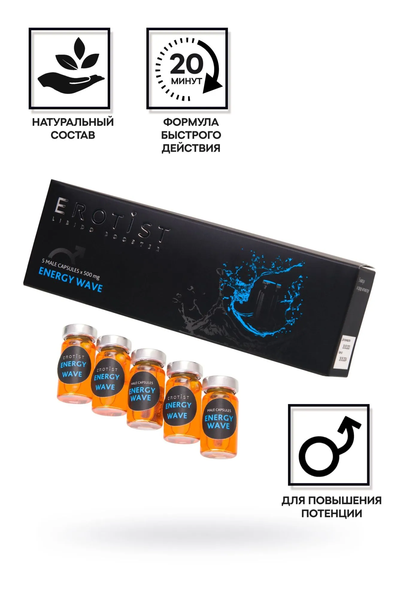 Мужская сила и сексуальное долголетие в условиях современной жизни ежедневно подвергаются угрозам. На помощь приходит пищевая добавка на основе растительных компонентов для мужчин Energy Wave, направленная на продление полового акта, улучшение качества секса, устранение нейрогенной (психологической) причины преждевременной эякуляции, повышение либидо, улучшение потенции и сперматогенеза, а также защиту от негативного влияния стресса. Многокомпонентный препарат, в основе которого использована мицеллярная форма, представляет собой структурированную среду активатора на основе эссенциальных компонентов, источников антиоксидантного комплекса и бустер-капсулы, обогащенные гидрофильной формулой растительных биологически активных веществ и усиленная цинком и комплексом витаминов. Капсулы в среде активатора “Энергетическая волна” не только поднимают либидо, пробуждают желание близости и разжигают страсть, но и способствуют: Стабильной эрекции Предотвращению преждевременного семяизвержения Пролонгации полового акта (увеличению времени) Капсулы в среде активатора Energy Wave способствуют обеспечению притока крови к пещеристому телу и улучшению эрекции (при наличии сексуальной стимуляции). Активные компоненты комплекса направлены на улучшение кровообращения, насыщение крови кислородом, что положительно влияет на общий половой тонус и состояние организма в целом. Активизация действия комплекса и раствора происходит только в условиях среды тонкой кишки и при пролонгированном высвобождении активных веществ из капсулы. При этом биохимическом синтезе в условиях организма образуется активная натуральная формула с участием собственных клеток и ферментов, что способствует полному усвоению активных компонентов и быстрому воздействию на функции половой сферы, увеличению продолжительности интимной близости и усилению яркости ощущений при оргазме. Рекомендации по применению: вскрыть флакон, содержимое флакона (жидкость вместе с капсулой) принимать одновременно (за 1 раз) за 10-20 мин до полового акта, запивая 100 мл теплой воды. После приёма капсулы в среде активатора происходит улучшение кровотока в области органов малого таза, что способствует возникновению стойкой эрекции. Рекомендованная суточная доза 1 флакон. Основные действующие компоненты: Корень женьшеня применяют как стимулятор либидо. Способствует улучшению кровоснабжения полового члена, тем самым усиливая половое влечение. Улучшает качество спермы и продлевает эрекцию. Рекомендуется использовать, как профилактическое средство от полового бессилия и снятия признаков переутомления и стресса. Гидрофильная вытяжка морского конька оказывает стимулирующее воздействие на сперматогенез, стимулирует половую функцию, устраняет половую слабость у мужчин, улучшает оргастические ощущения. Экстракт травы цистанхе солончаковой успешно применяется как мощный афродизиак при половом бессилии мужчин, бесплодии, истощении. Цистанхе рекомендуется при проблемах в мужской и женской половой сфере, при заболеваниях мочевыводящих путей, нарушениях в системе кровообращения. Вытяжка из травы подавляет тревожность и устраняет страх неудачи в интимной сфере. Плоды бархата амурского способствуют поддержанию потенции, снижают риск развития простатита и аденомы предстатель