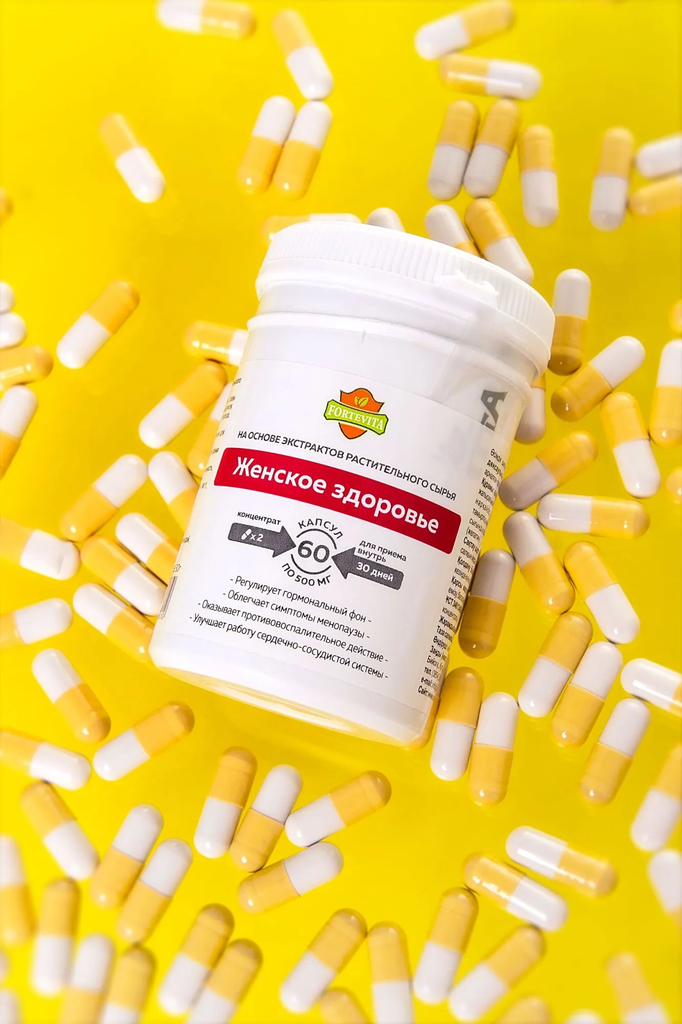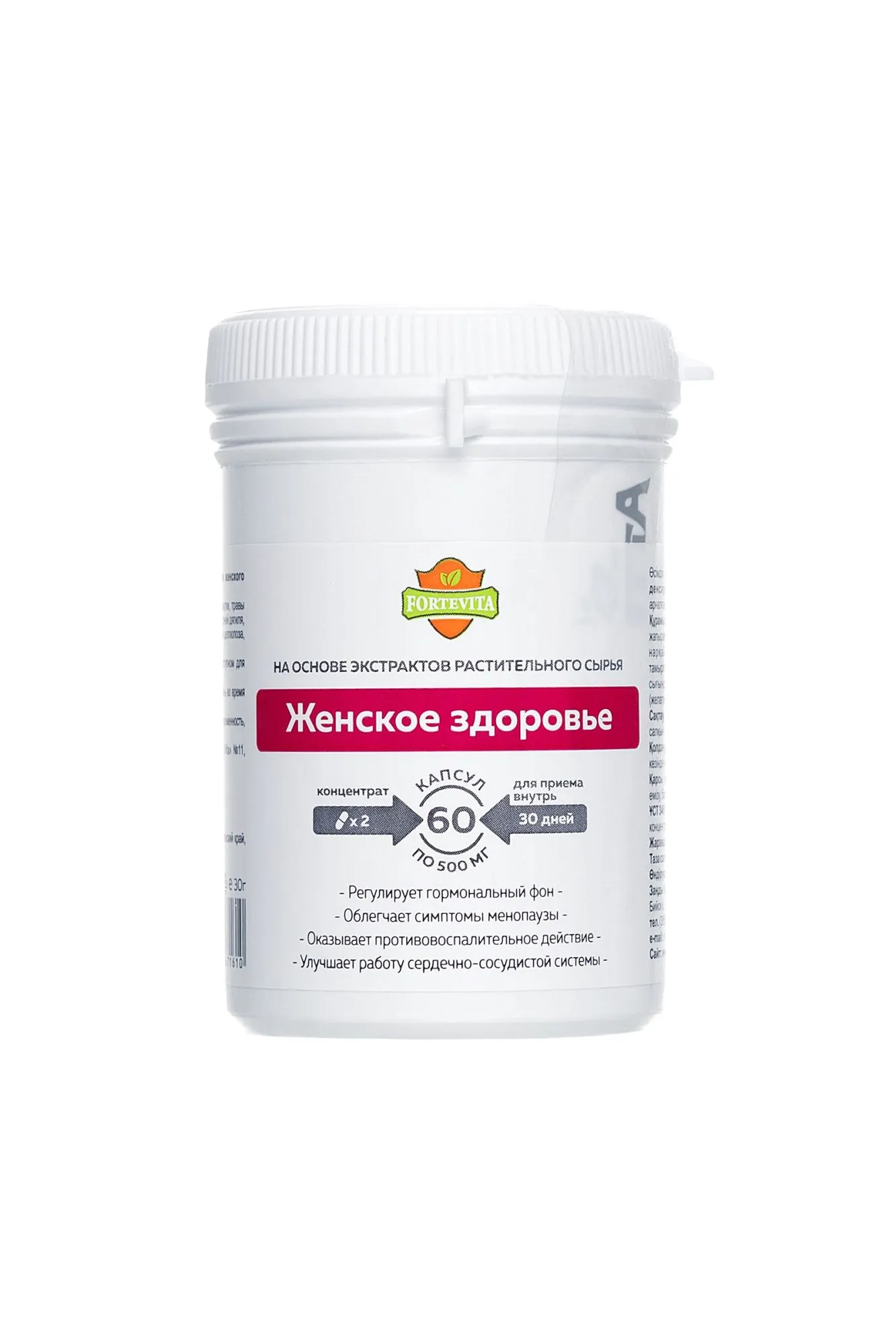 «ForteVita» «ЖЕНСКОЕ ЗДОРОВЬЕ» 60 капсул по 500 мг Все самое лучшее, что может дать природа для женского здоровья, собрано в биологически-активной добавке ForteVita "Женское здоровье". Поддерживать молодость, красоту и активный образ жизни помогает концентрат Женское здоровье. Принимая по 1 капсуле 2 раза в день во время еды в течение 30 дней, вы почувствуете прилив энергии, улучшение умственной и физической активности. Сочетание целебных трав и растений-афродизиаков положительно действует на либидо и гормональный фон, что особенно важно в период менопаузы. Сочетание экстрактов корней красной щётки, листа боровой матки, травы душицы, листа дамианы, травы вербены, травы горянки, корней дягиля, травы пустырника, корней заманихи не только активирует иммунную систему организма в целом, но и обладает противовоспалительным действием улучшает эндокринную функцию и нормализует гормональный баланс ускоряет обмен веществ и бережет нервную систему стимулирует половое влечение и качество секса помогает сконцентрироваться и повысить работоспособность влияет на антиоксидантную защиту организма дает яркие и длительные сексуальные ощущения в вашей интимной жизни. Проявите свою природную сексуальность и чувственность по-новому. Быть страстной, желанной и порхающей – все это дает Женское здоровье ForteVita. Активная и уверенная женщина, защищенная от стресса и усталости – откройте и выпустите свою внутреннюю Богиню. Противопоказания: индивидуальная непереносимость, беременность, кормление грудью. Количество в упаковке: 60 капсул Срок годности: 24 месяца