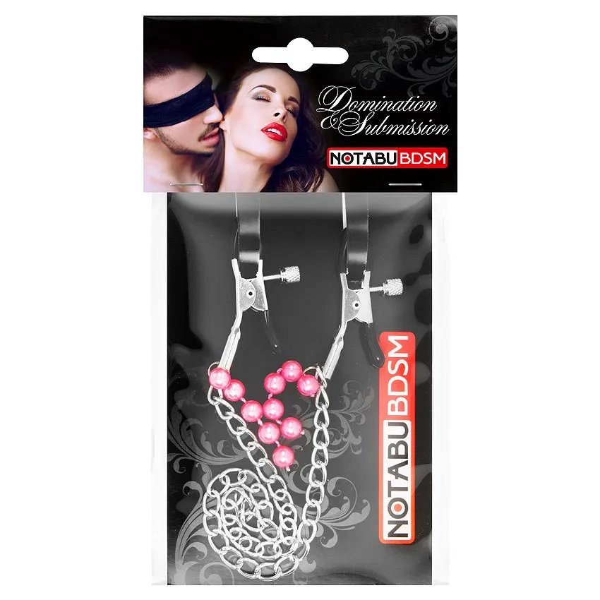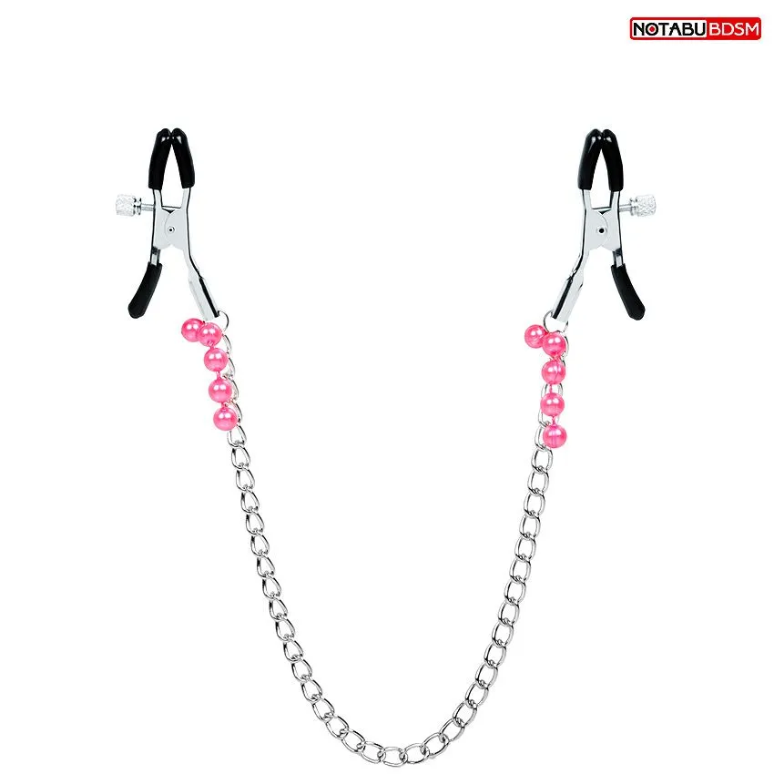 Изящные аксессуары для стимуляции сосков и усиления сексуального возбуждения. На концах зажимов имеются специальные эластичные накладки, препятствующие сильному сдавливанию и травмированию сосков. Зажимы соединены лёгкой металлической цепочкой и украшены подвесками из бусин, что даёт эффект утяжеления.