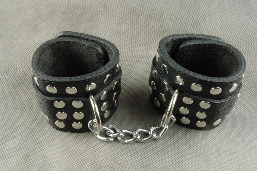 Наручники подшитые черным велюром, зафиксированные между собой сварной цепочкой длиной 140 мм. Прямоугольная база шириной 65 мм, с центральным ремнем шириной 25 мм поверх базы, с декоративной металлической фурнитурой по краю. По центру наручников сварное D-кольцо, зафиксированное хольнитенами. Застежка, с регулирующим размер ремешком и пряжкой, проходит поверх базы. Наручники подойдут для запястья с обхватом от 140 мм до 220 мм.