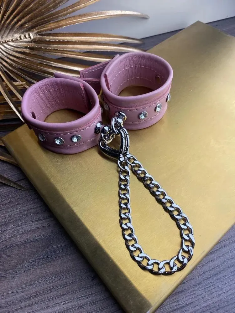 —Наручники ПУНШ (розовая кожа, стразы и поводок 2 сердечка)