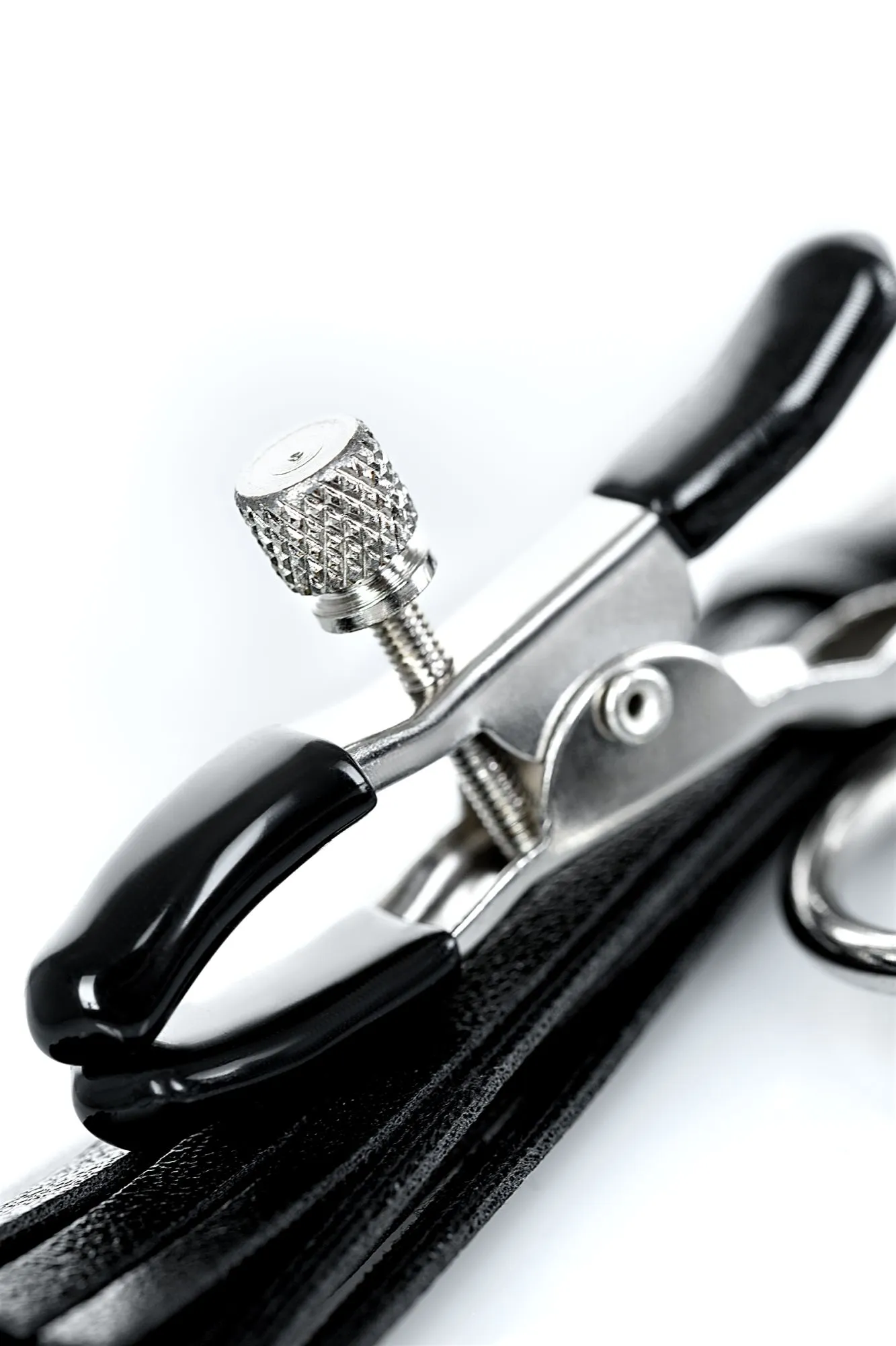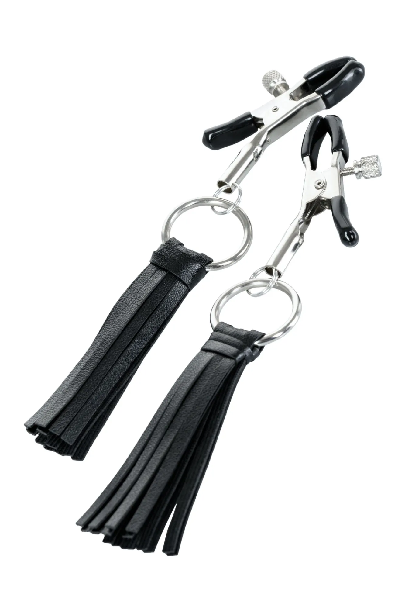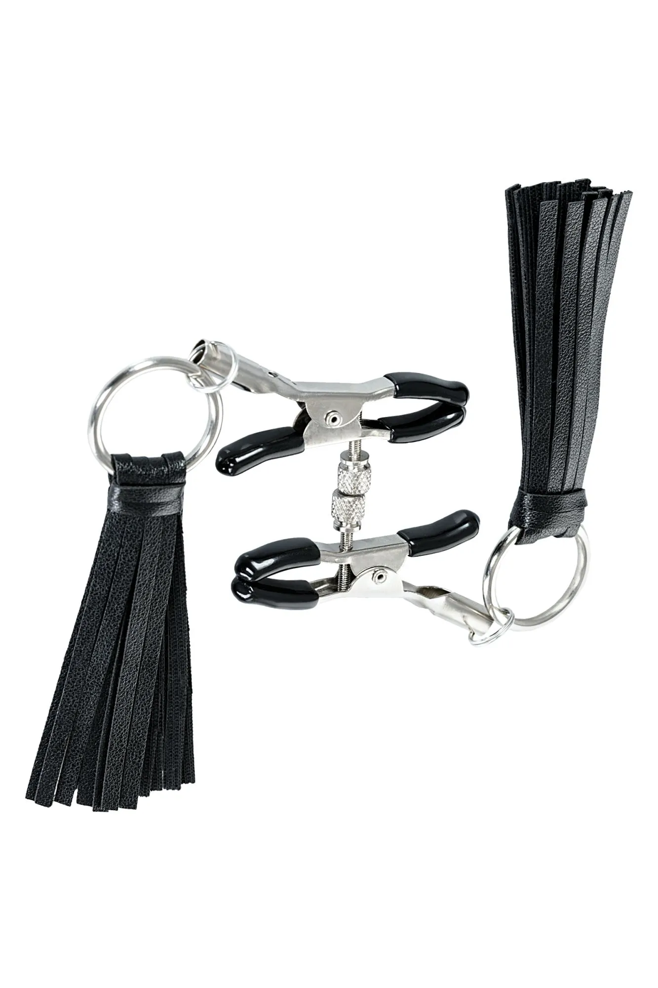 Зажимы классической формы украшены кисточками из PU- кожи. Они не только стимулируют соски, но и придают игривый вид. Сдавливание регулируется болтиком и может быть усилено или уменьшено во время интимной игры. Покрытие на концах зажимов защищает нежную кожу.