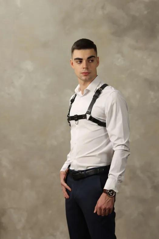 Стильная и необычная мужская портупея, полностью выполненная из натуральной кожи. Декорирована качественной металлической фурнитурой. Аксессуар двусторонний: его можно носить по разному, меняя положение по Вашему желанию. Стильный элемент для Вашего образа, который будет особенно эффектно смотреться на обнаженном мужском теле и возбуждать фантазию!