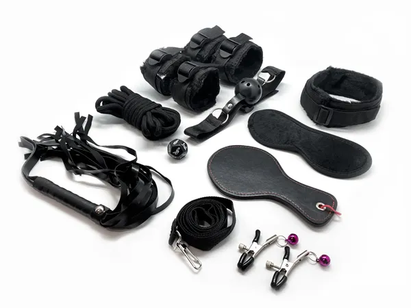FURY — набор из 10 БДСМ-аксессуаров, включающий наручники, ножные кандалы, ошейник с поводком, кляп, плеть, маску, веревку шибари, лопатку, зажимы для сосков и кубик, идеально подходит для разнообразных сценариев. Вес набора составляет 366 г, что делает его компактным и удобным для хранения. Защита от брызг IPX2 обеспечивает базовую устойчивость к влаге. Цвет — черный.