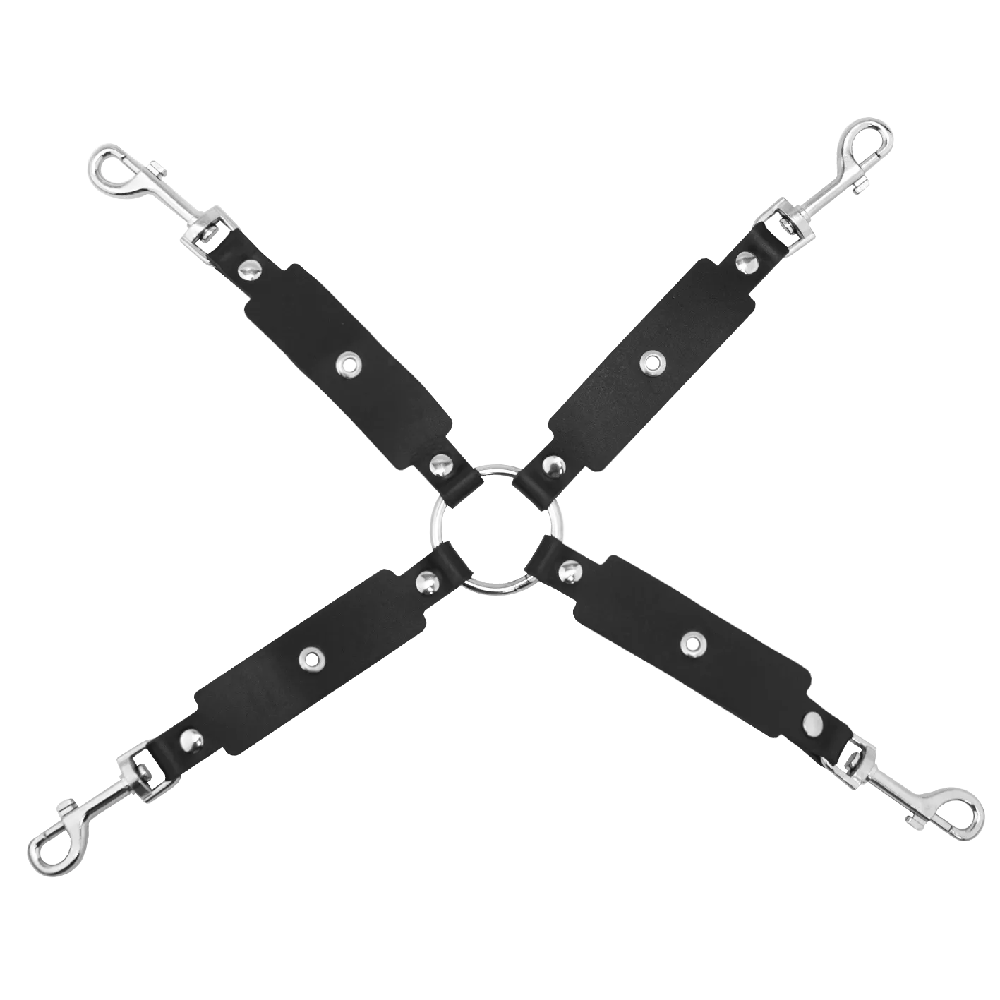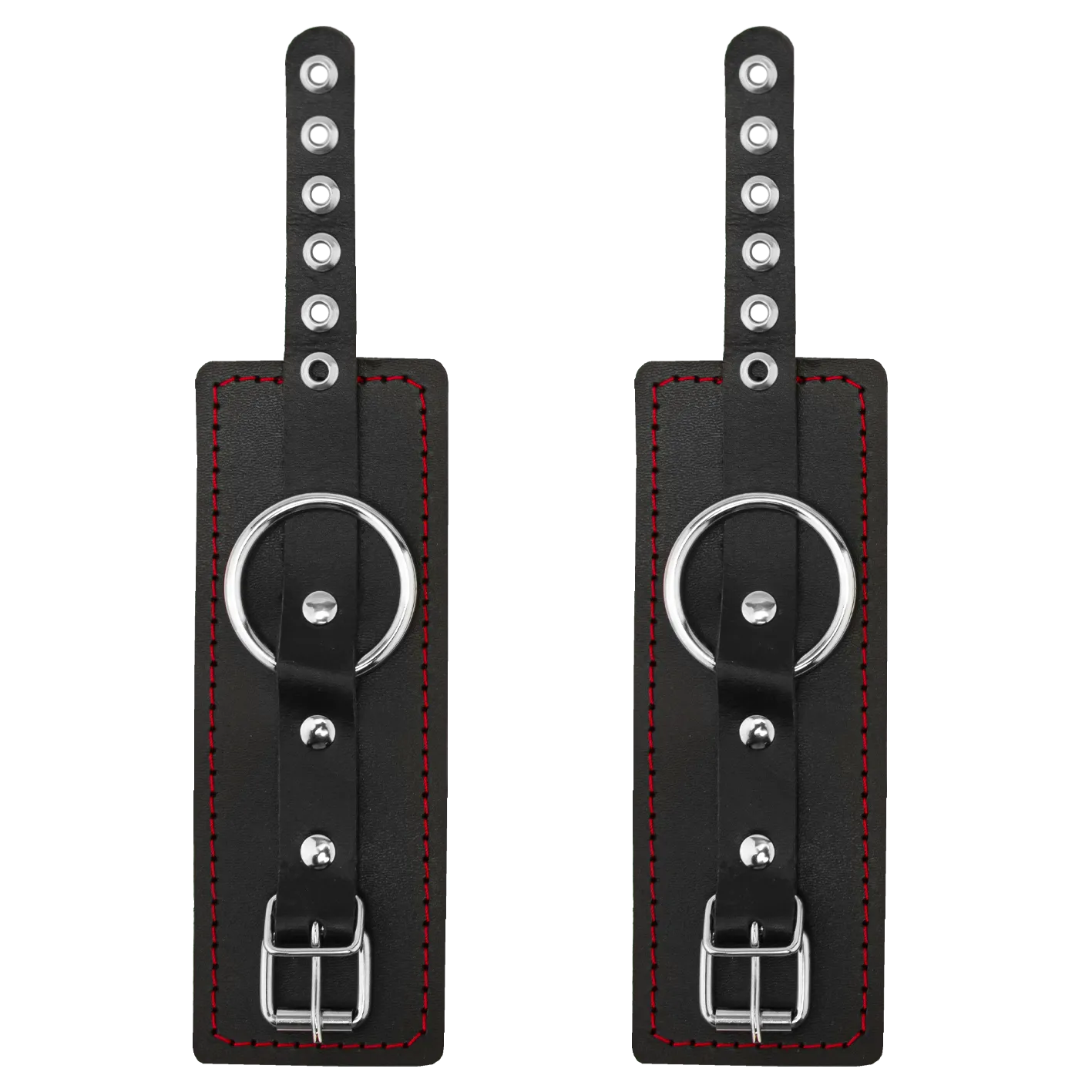 На каждом конце креста есть карабины, при помощи которых Вы сможете присоединить к ним наручники и поножи или же другие аксессуары. Однослойные наручники и оковы выполнены из натуральной кожи черного цвета и декорированы контрастной строчкой.