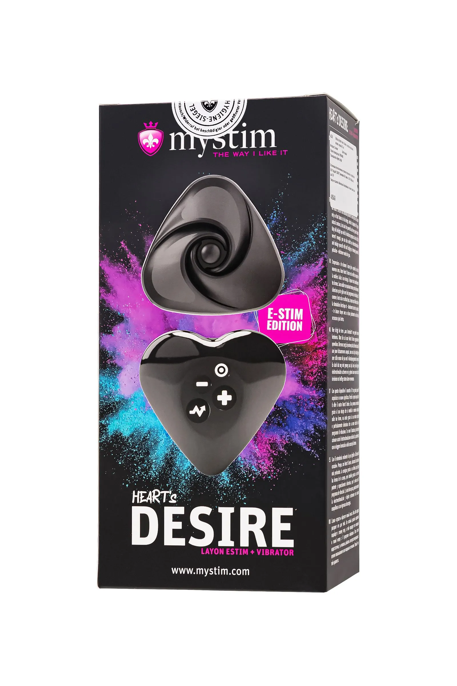 Добро пожаловать в мир роскоши с Mystim Heart's Desire Black Edition - инновационным вибратором, визуально напоминающим нежный цветок, обладающим таинственной функцией электростимуляции. Насладитесь ощущениями роскоши и страсти, погрузившись в этот уникальный опыт. Эта неповторимая игрушка подарит вам моменты нежности и интимности. Дизайн игрушки с ручкой в форме сердца создает атмосферу романтики, а мягкая текстура, форма которого напоминает ваши естественные контуры, с дополнительным точечным стимулятором, погружает вас в мир бескрайних наслаждений. Позвольте этому опыту стать исключительным, зажмите ручку между пальцев и отправляйтесь в путешествие по собственному телу. Ощутите многогранность удовольствия с 8 режимами вибрации, предоставляющими вам полную свободу выбора. Но настоящей звездой Heart's Desire Black Edition является функция электростимуляции. Этот вибратор-электростимулятор откроет перед вами мир электро-импульсов, создавая невероятные волны возбуждения. С 5 уникальными режимами и 10 уровнями интенсивности, вы сможете подобрать идеальную комбинацию для себя. Это путешествие в мир страсти, где каждая волна усиливает ваши ощущения. Особая функция электростимуляции, добавляющая живительное кровообращение, призвана доставить вам невероятное наслаждение. Ощутите легкие, дразнящие ощущения, оживляющие вашу чувственность. Однако помните, что электростимуляция имеет свои ограничения и не рекомендуется при наличии металлических имплантов, сердечных заболеваний или беременности. Перед покупкой внимательно изучите инструкцию от производителя, чтобы насладиться безопасным и удовлетворительным опытом.. Элегантный дизайн Heart's Desire скрывает истинное назначение девайса. Эта игрушка, воплощающая желания вашего сердца, продумана до мелочей, чтобы удобно и комфортно располагаться в ваших руках. Добавьте немного лубриканта на водной основе для более мягкого, ухаживающего касания. А после этого волшебства используйте специальные средства для легкой очистки. Поддерживайте вашу игрушку заряженной с помощью удобного магнитного USB-кабеля - это ваш путь к долгим моментам блаженства. Погрузитесь в океан наслаждения, который дарит Mystim Heart's Desire Black Edition: Блокировка кнопок. Чтобы включить или отключить блокировку кнопок, одновременно нажми и удерживай кнопку вибрации и кнопку «Минус» или «Плюс» в течение 3 секунд. (При этом кнопки несколько раз кратковременно мигнут.) Внимание: новое устройство поставляется с включенной блокировкой кнопок, поэтому перед первым использованием блокировку нужно отключить. 5 видов электростимуляции и 10 уровней интенсивности 8 режимов вибрации и 5 уровней интенсивности Уникальный режим стимуляции кровообращения Компактные размеры: длина: 6,7 см, ширина: 6,7 см, высота: 6,2 см. Изготовлен из 100 % медицинского платинового силикона и ABS-пластика. Цвет - глубокий черный Магнитное зарядное устройство Mystim и USB-зарядное устройство в комплекте