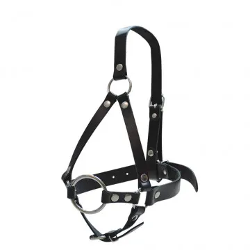 Кляп-рамка со сбруей на голову изготовлен из натуральной высококачественной кожи чёрного цвета. Зафиксировать и отрегулировать изделие можно при помощи металлической пряжки. Вся металлическая фурнитура имеет никелевое покрытие. D кольца = 4см.