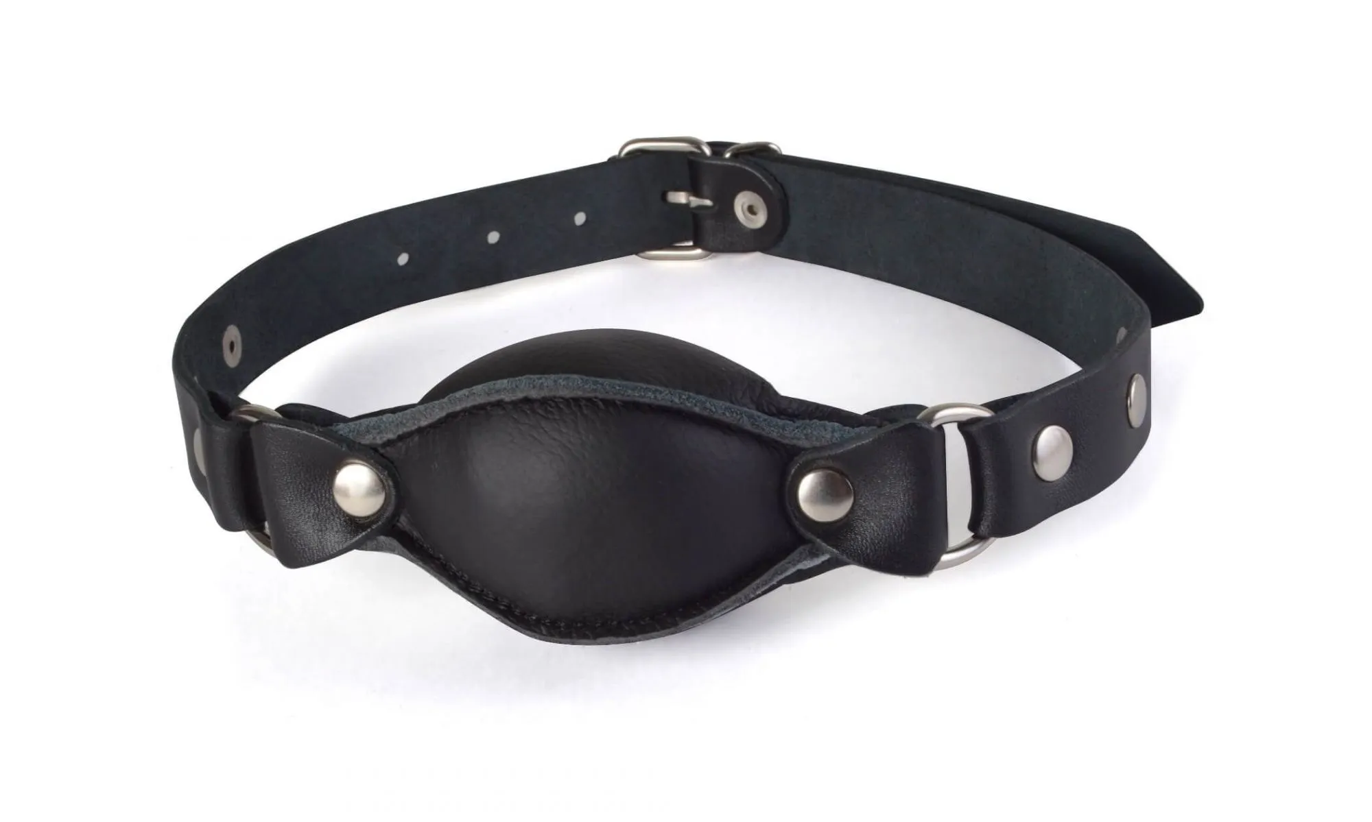 Кляп выполнен из натуральной кожи черного цвета. Он заполнен таким образом, чтобы быть достаточно плотным и упругим, но при этом давать немного сжиматься зубам. Кляп можно регулировать по размеру при помощи ремешка с пряжкой.