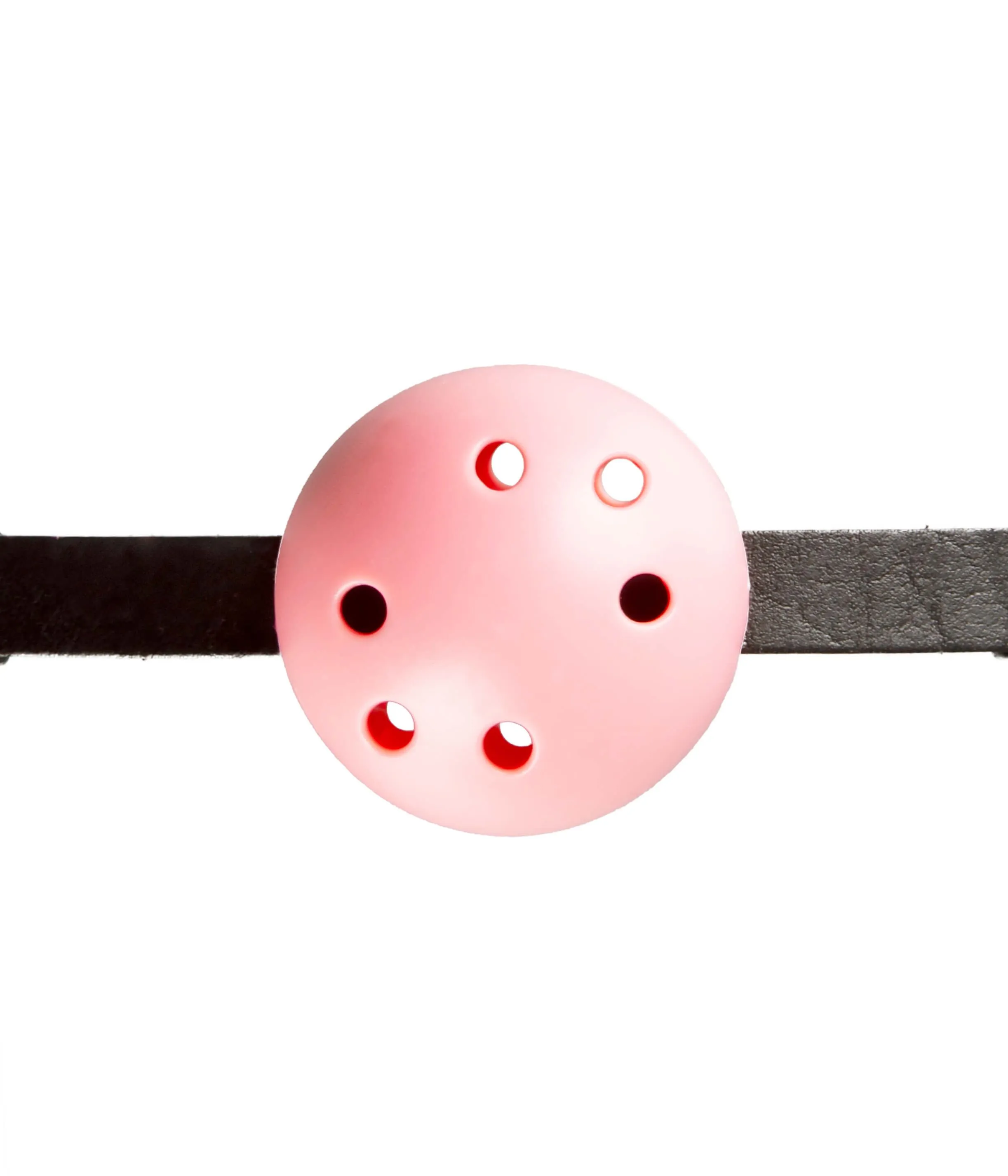 - Розовый шар на кожаном ремешке полностью закрывает рот.