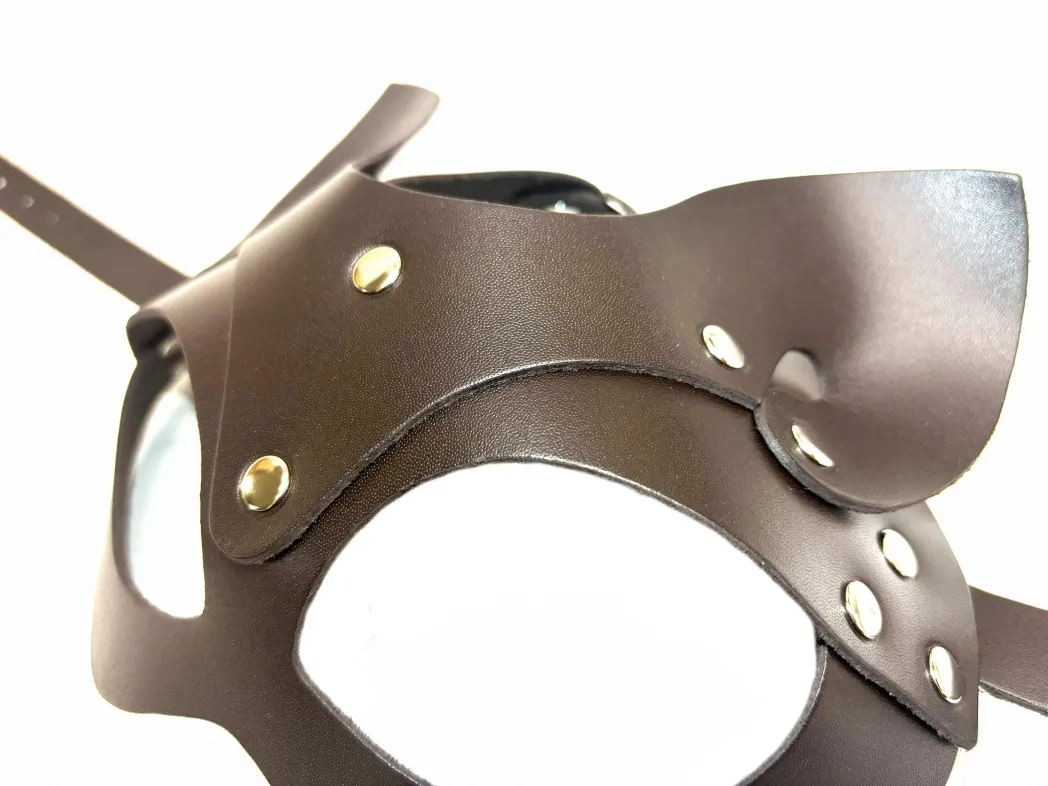 Восхитительная, сексуальная маска кошки. Выполнена из натуральной кожи в красивом шоколадном оттенке, удобно фиксируется с помощью пряжки, легко регулируется по размеру. Прекрасно держит форму благодаря плотной качественной коже. Идеально подходит под любую форму головы, подчёркивая глаза. Эта маска поможет Вам создать яркий, игривый образ страстной кошечки. Материал: натуральная кожа, металл