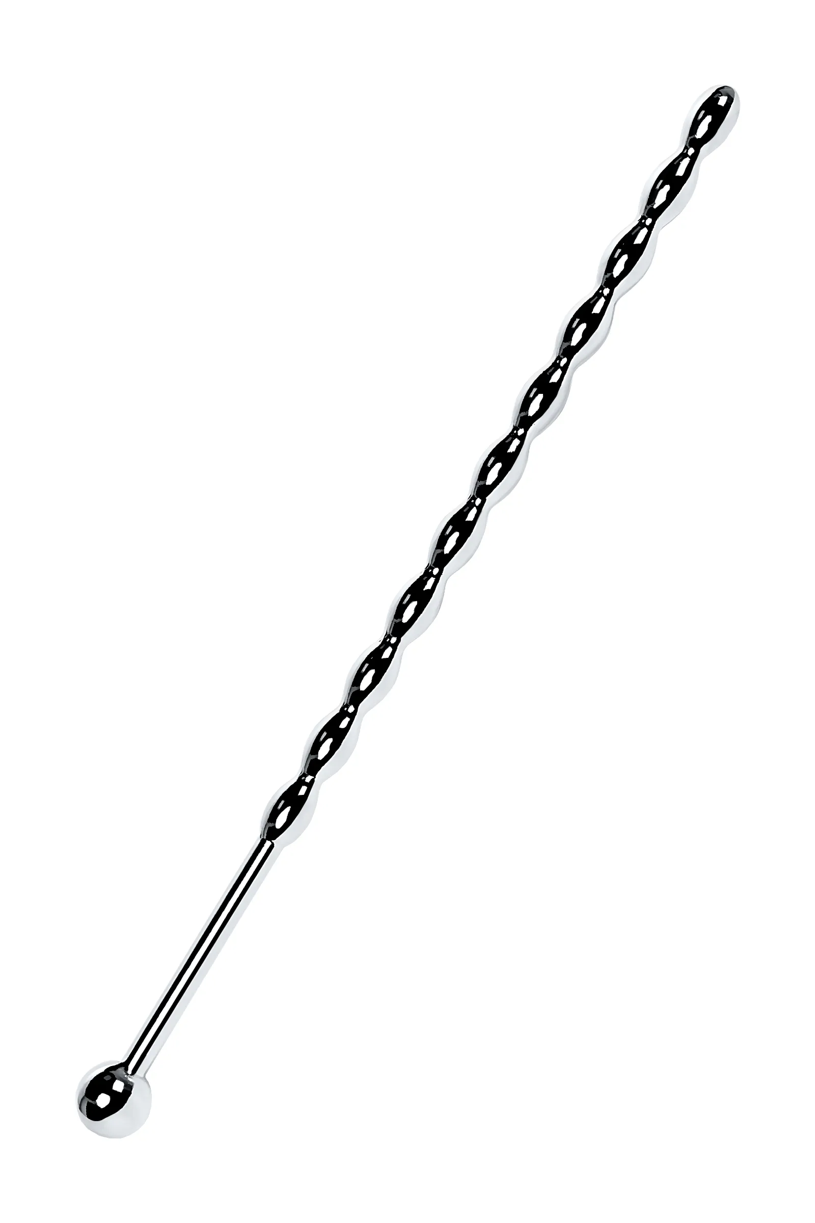 Уретральный плаг в форме косички. Небольшие звенья плавно меняют диаметр. Прекрасный вариант для исследования чувствительности своего организма: шарик на конце и удлиненное расстояние до фигурной части добавляют удобства при стимуляции уретры.