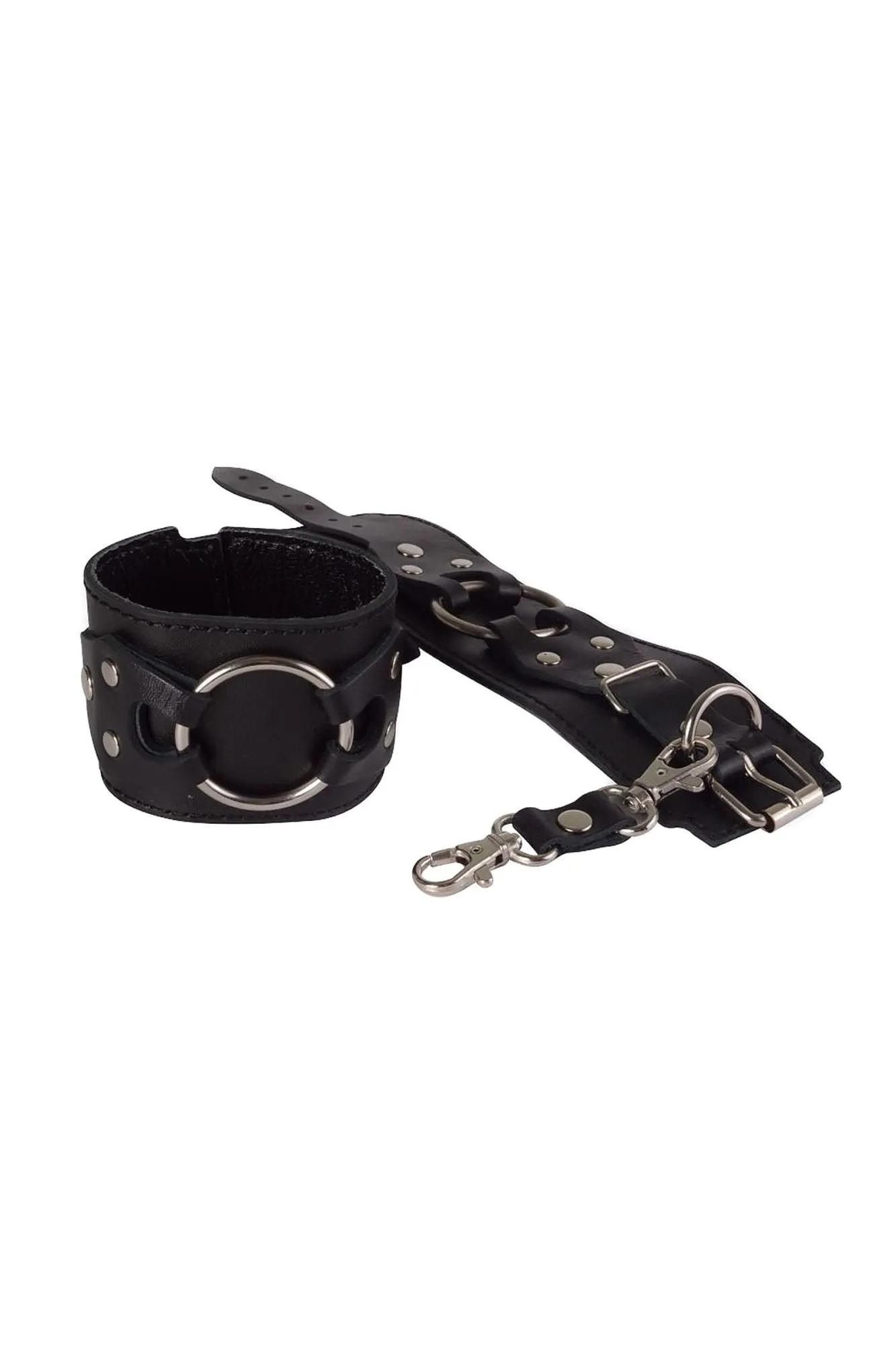 Черные наручники из натуральной кожи от Ситабелла помогут ограничить движения секс-партнёра, достаточно лишь одеть на запястья комфортный, но прочный девайс. Лаконичные, но при этом красивые наручники подойдут, как для женщин, так и для мужчин, т.к. размер легко регулируется при помощи металлической пряжки. Готические фигурные накладки, удерживающие большое металлическое кольцо, придают наручникам агрессивной сексуальности и роскоши. Соединяются наручники при помощи небольших карабинов, скреплённых кожаной перемычкой. Для комфортного использования внутренняя часть наручников выполнена из бархатистой велюровой кожи. Вся металлическая фурнитура имеет никелевое покрытие. Общая длина около 27 см Ширина 5,5 см