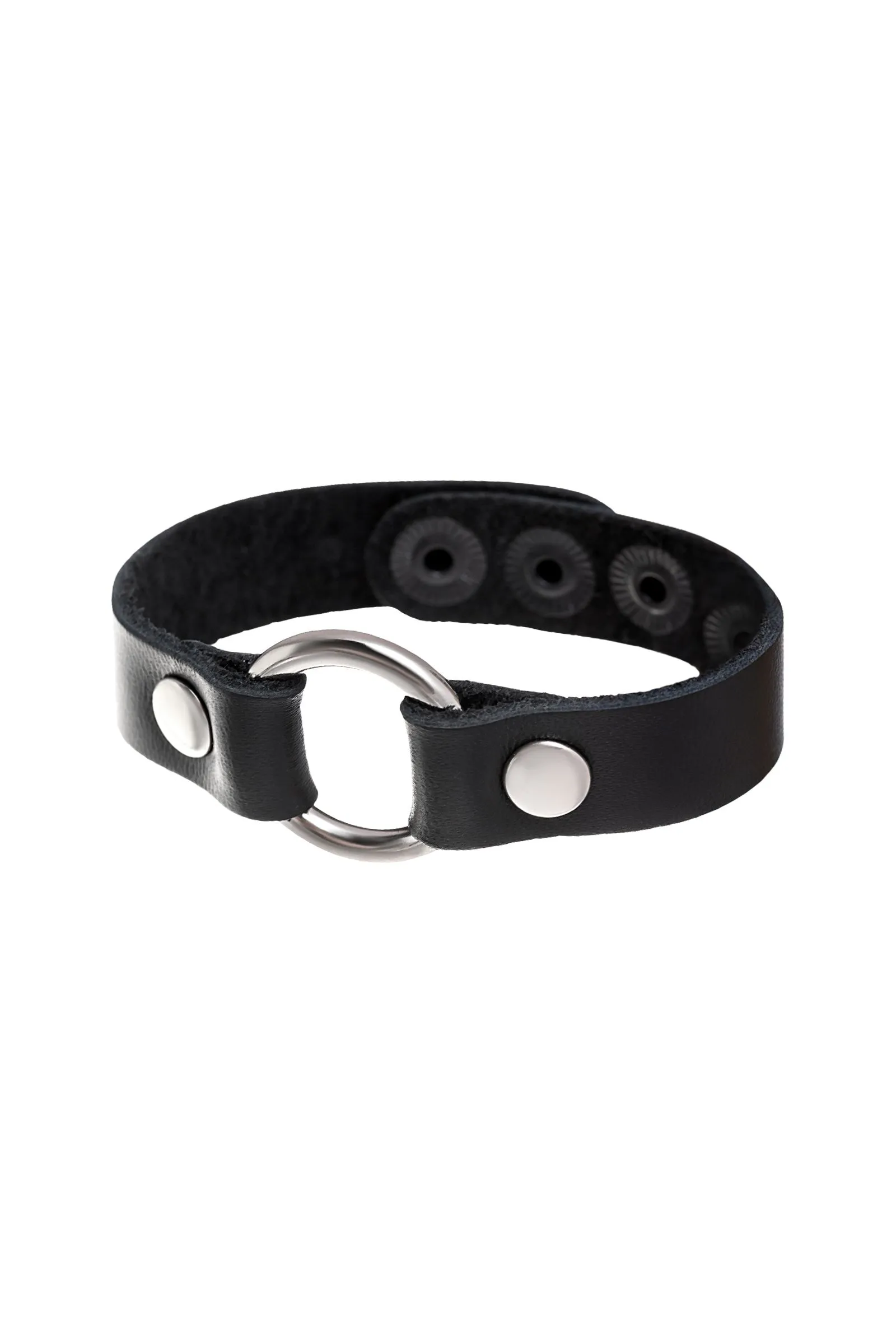 Браслет из натуральной кожи черного цвета украшен металлическим кольцом. Регулируется при помощи кнопок. Длина браслета 21 см, ширина 1,5 см. Металлическое кольцо имеет никелевое покрытие. Масса нетто 10 гр.