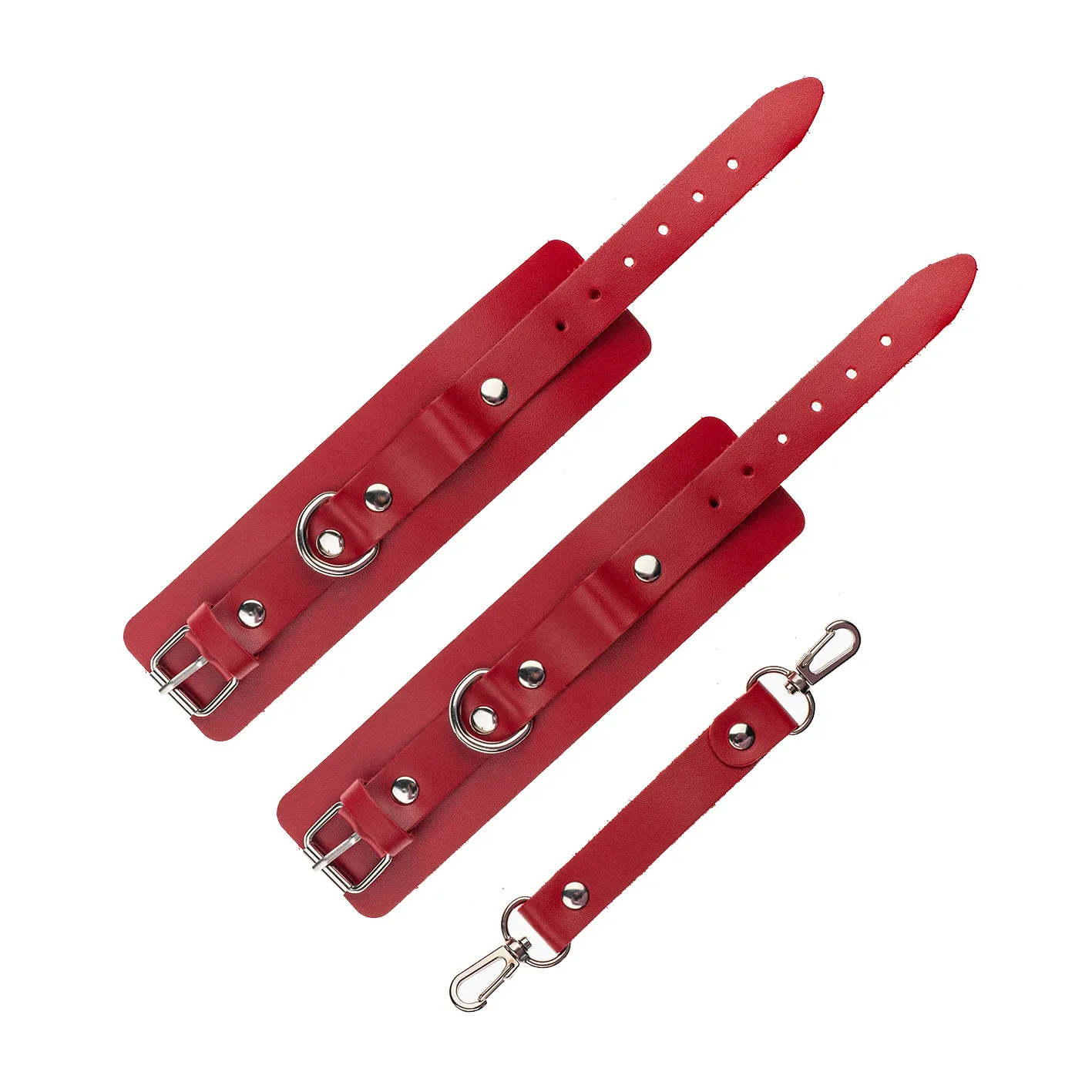 Теперь Доминант покажет, что значит грубое обращение и полный контроль над свободой. Красные наручники с металлической отделкой на самом деле твёрдо обхватывают руки и надежно соединяют их между собой коротким кожаным ремешком на карабинах. Предусмотрено место для крепления дополнительных аксессуаров. Можно придумывать разные варианты фиксации.