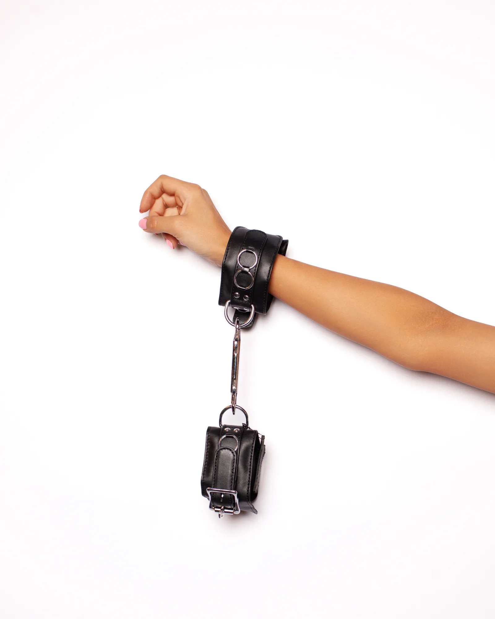 Стильные наручники из натуральной кожи премиум качество с соединительными карабинами из нержавеющей стали. Наручники дополнены дизайнерскими вставками в виде небольших металлических колец. Размер наручников легко регулируется с помощью застежки.