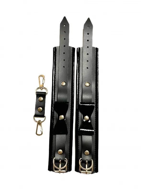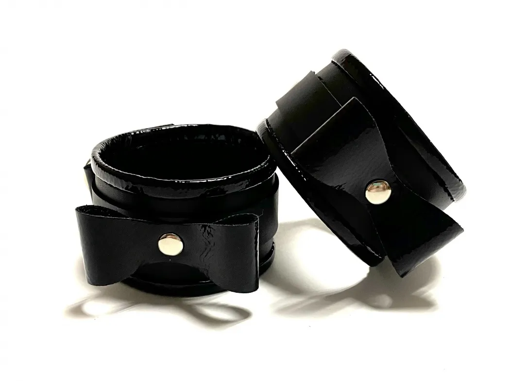 Красивые и функциональные наручники черного цвета, выполненные из искусственной кожи. Декорированы металлической фурнитурой, лаковыми бантиками и вставками по краям. Обхват удобно регулируется с помощью пряжек. Ширина наручников 4,5см, общая длина наручника вместе с ремешком 30см. В комплекте идет соединение с карабинами, общая длина соединения 11см. Очень экономичный, экологичный и практически незаменимый аксессуар для вашей любовной игры! Материал: эко-кожа, металл Цвет: черный
