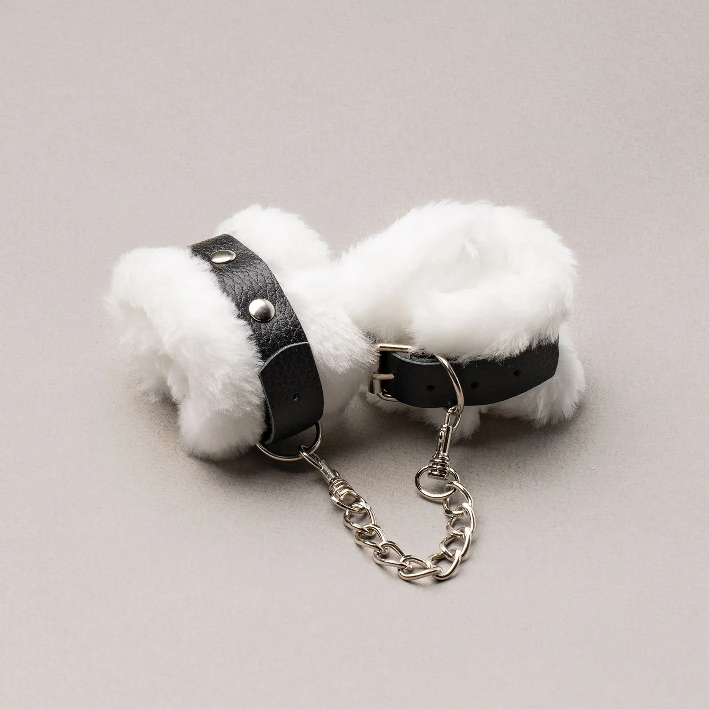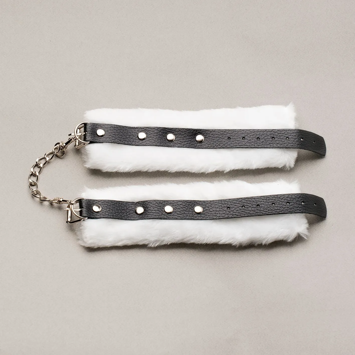 Длина наручников - 21 см, ширина - 6 см. Наручники между собой соединены прочными карабинами с металлической цепью длиной 12 см. Ремешок-фиксатор изготовлен из натуральной кожи и украшен стразами. Размер ремешка: 27 х 2 см.