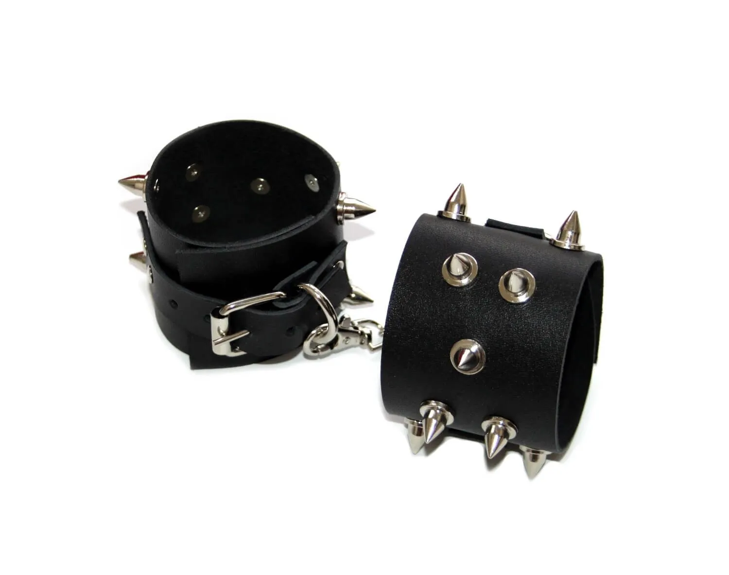 Поножи от бренда Pink Rabbit сделаны из натуральной кожи черного цвета и соединены между собой при помощи короткой цепи с карабинами. Они декорированы рядом металлических шипов, придающим им более дерзкий и агрессивный вид. Такой аксессуар позволит Вам обездвижить ноги своего партнера, лишив его возможности сопротивляться и препятствовать Вашим ласкам. Невозможность двигать ногами обострит все чувства партнера, делая его особенно чувствительным ко всем прикосновениям. Поножи разнообразят Ваши интимные игры и позволят испытать новые ощущения во время интимной близости.