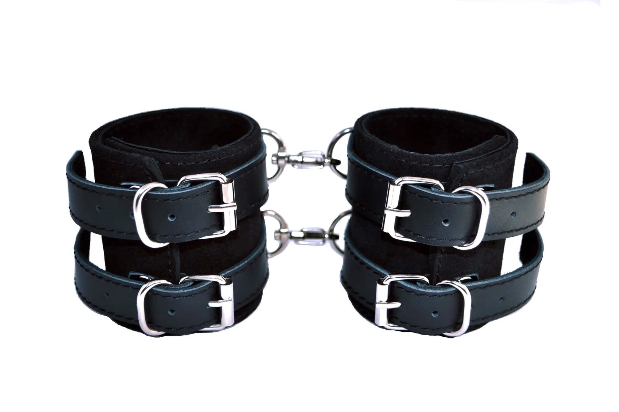 Наручники соединены между собой металлическими карабинами. Их можно регулировать по размеру ремешками с пряжками.
