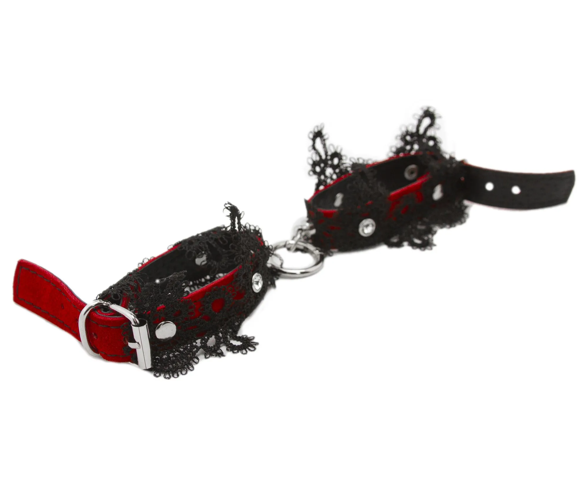 Наручники сделаны из замши и декорированы тонким кружевом. Они соединены между собой металлическим кольцом на карабинах. Наручники регулируются по размеру ремешками с пряжками.