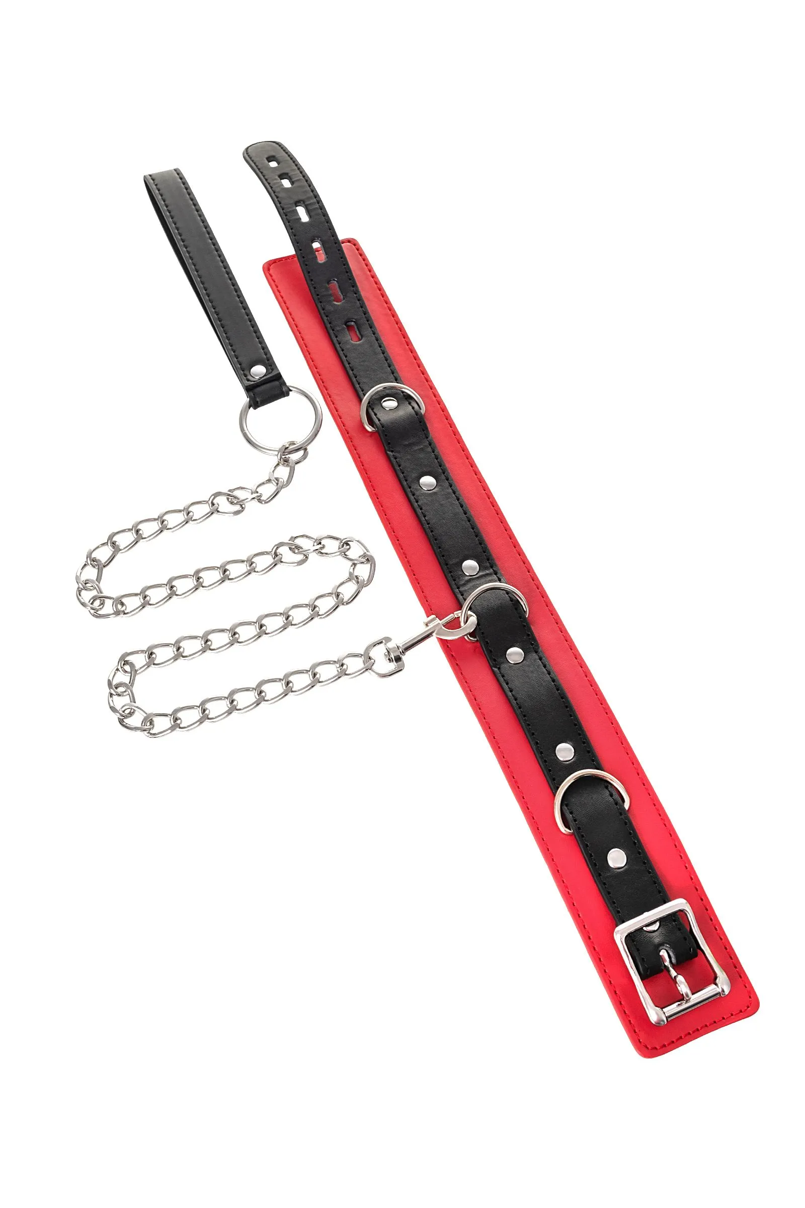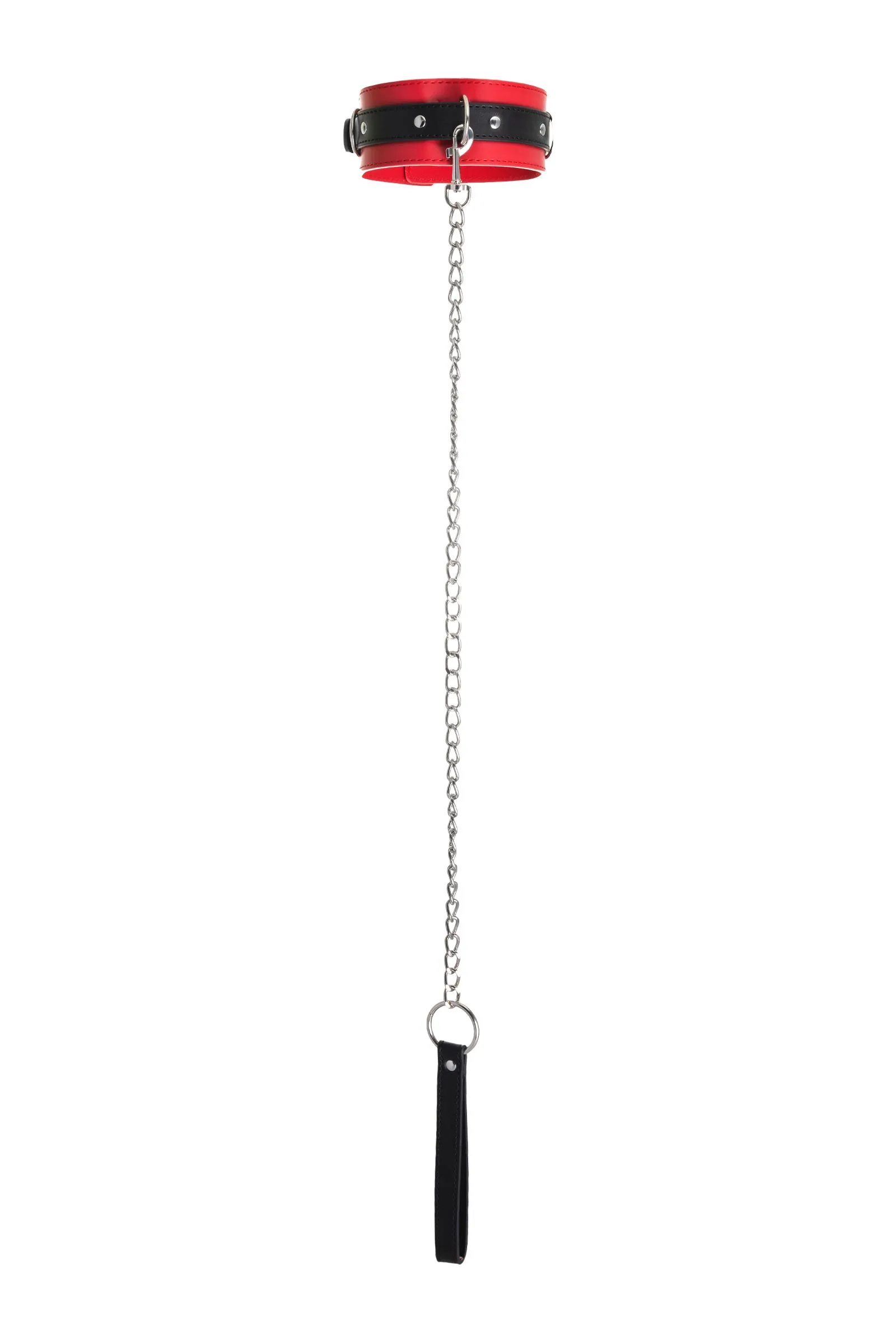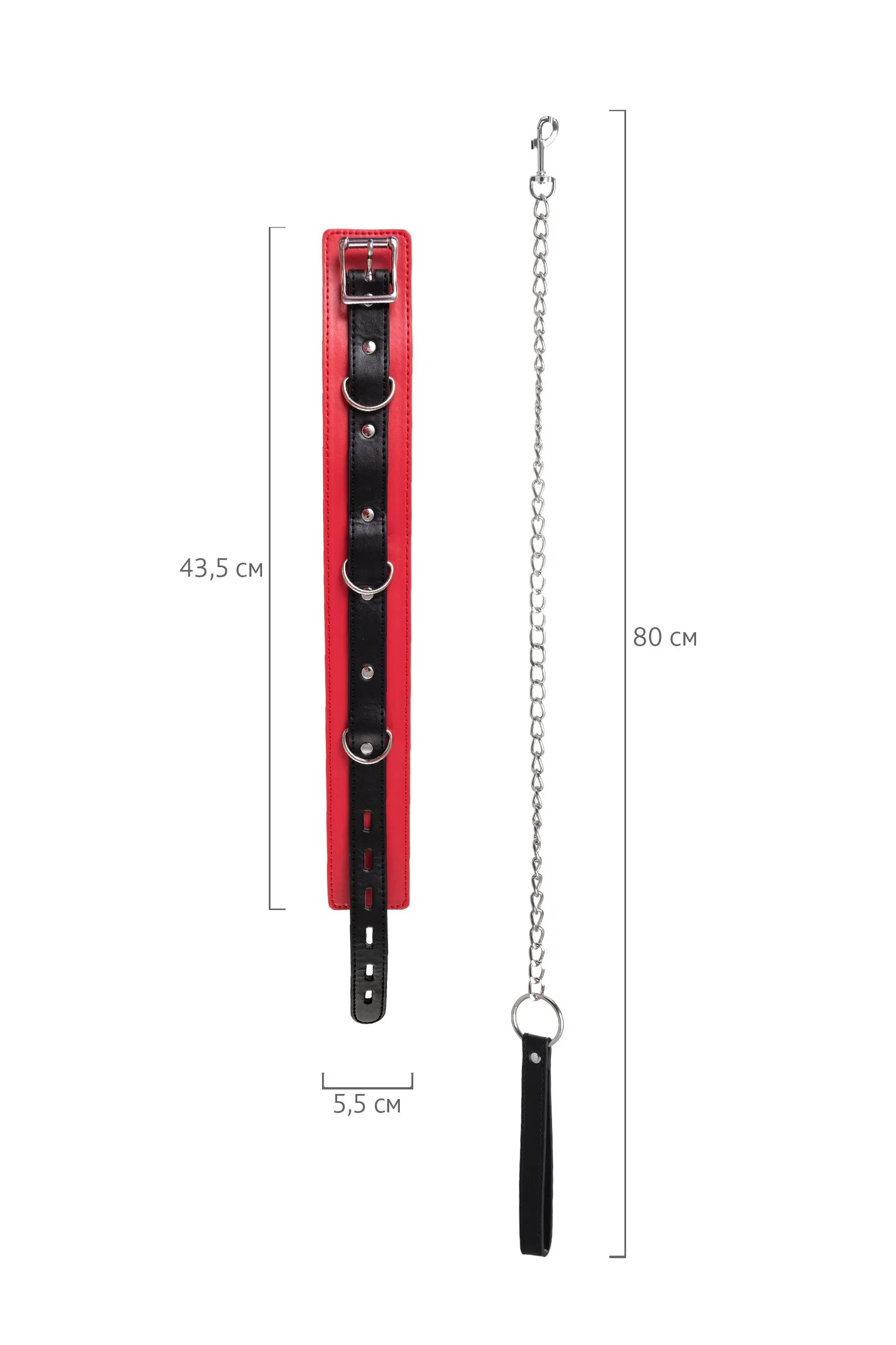 Атрибут для вашего лучшего перфоманса – яркий ошейник. Это не только символ подчинения и доверия, но и изюминка, способная разукрасить вашу интимную жизнь игрой. В этом ошейнике сочетаются элементы, возбуждающие страсть и фантазию: кожа красного и черного цветов и отделка металлическими элементами. Ошейник прекрасно вписывается в любой эротический образ – будь на вас сексуальный комплект белья, или только помада алого цвета. Мягкая кожа нежно облегает шею, а размер легко регулируется надежной металлической пряжкой. Передать власть партнеру легко с помощью поводка длиной 80 см, который крепится к одному из колец. Играйте в доминирование и подчинение в свое удовольствие! Длина ошейника: 43,5 см Ширина ошейника: 5,5 см Длина поводка: 80 см Материал: экокожа