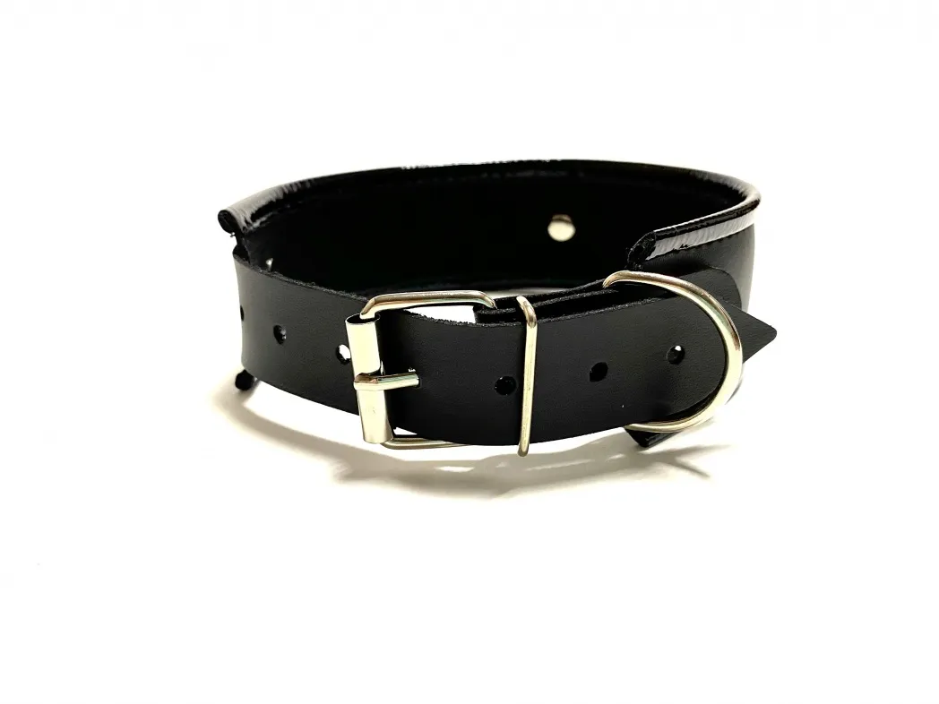 Минималистичный черный ошейник, выполненный из искусственной кожи. Аксессуар декорирован бантиком спереди и металлическим полукольцом, к которому можно пристегнуть поводок. Основная часть выполнена из матовой эко-кожи, а бант и вставки по краю - из лаковой, что придаёт ошейнику изящества. Общая длина ошейника вместе с пряжкой и ремешком 47см, ширина 4,5см.Этот ошейник может отлично дополнить образ и стать волнующим элементом любовной игры. Экономичный, экологичный и симпатичный аксессуар! Материал: эко-кожа, металл Цвет: черный