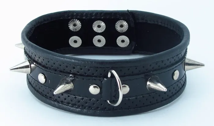 Ошейник черного цвета, выполнен из высококачественной кожи. Основание - перфорированная кожа, Вставка- кожа лак.Ширина фетиш атрибута составляет 3,5 сантиметров, имеет черную лаковую вставку, украшен шестью небольшими шипами по всей длине изделия. Размер регулируется при помощи застежек-кнопок. Для крепления различных элементов бандажа, а также поводков и цепочек на БДСМ девайсе предусмотрено одно сварное D-видное кольцо. Общая длина ошейника - 41 см