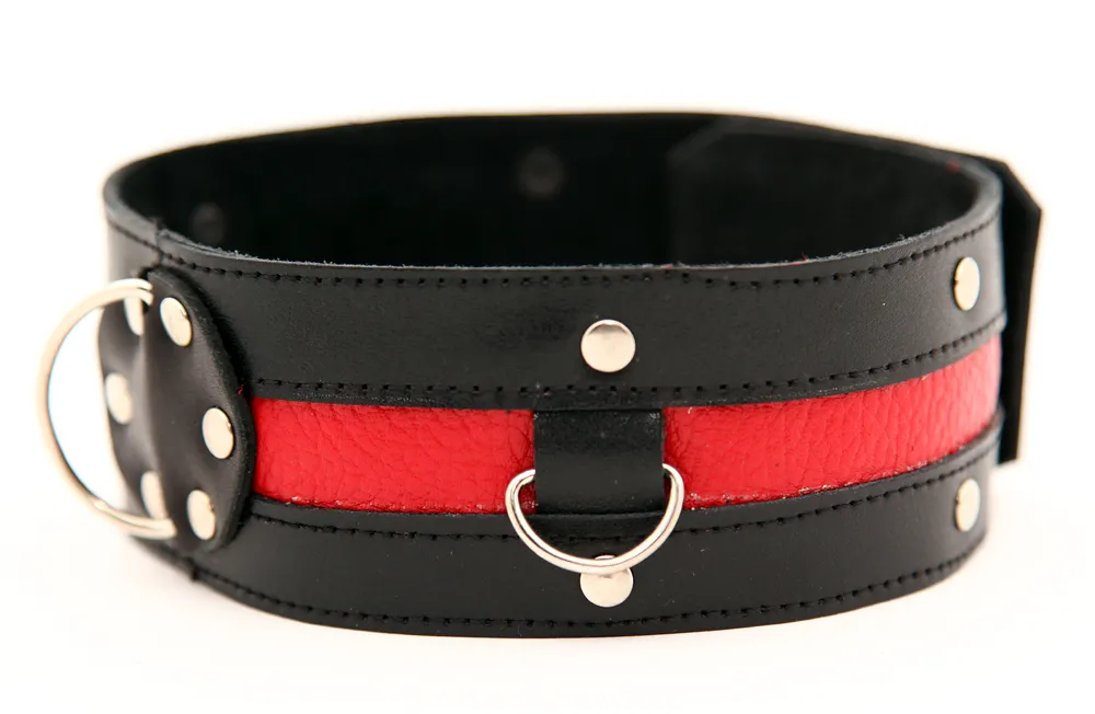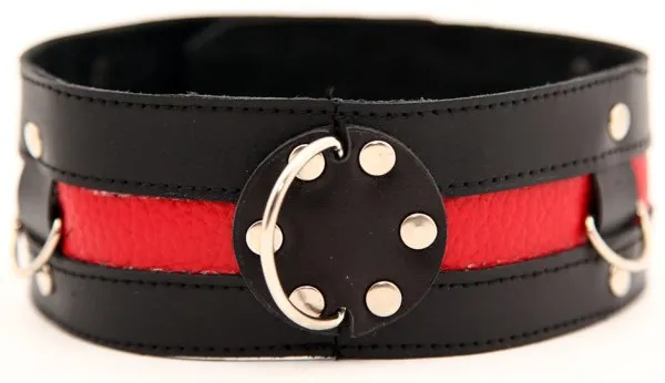 Черный кожаный ошейник с красной вставкой. Имеет три кольца для карабинов, три ряда заклепок-застежек. Ширина ошейника - 4,6 см. Размер регулируется.