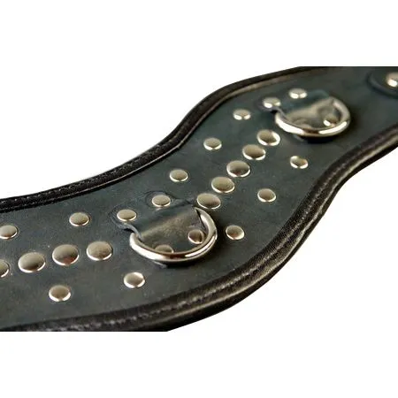 У этого черного фигурного ошейника от компании "Подиум" довольно необычная форма, благодаря чему выглядит он очень стильно и эффектно. Данная модель декорирована металлическими клепками и имеет несколько колец, за которые будет очень удобно цеплять, например, поводок. Ремешок с металлической пряжкой позволяет регулировать диаметр такого БДСМ аксессуара.