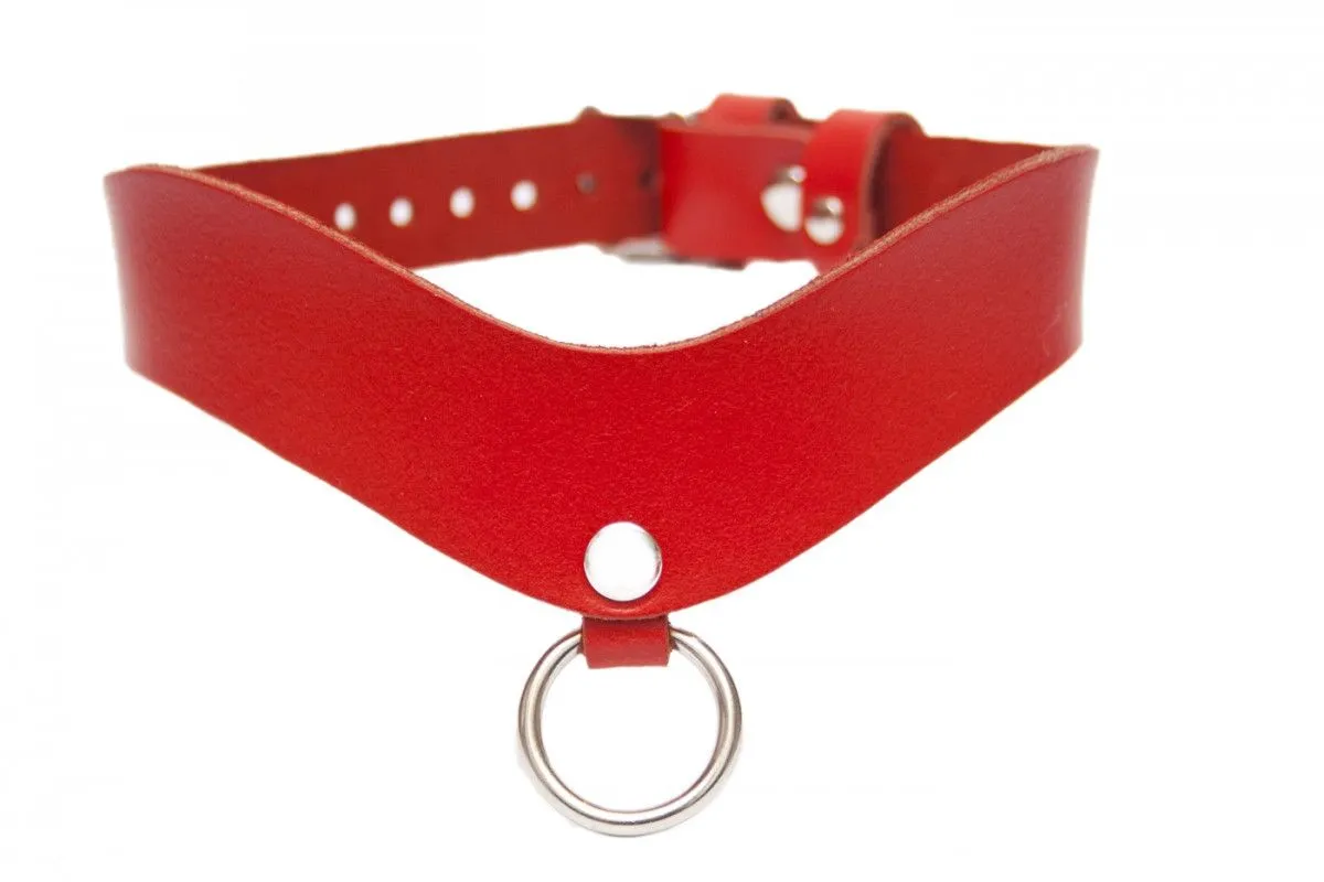 Ошейник стильной формы, единый отрез натуральной кожи и металлическое кольцо для поводка в центре.