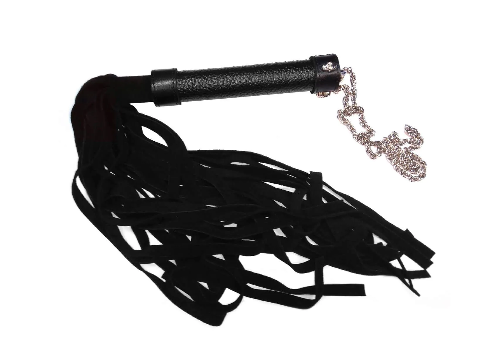 Плетка со множеством мягких хвостов идеально подойдет для тех, кто хочет попробовать что-то новое в постели и испытать яркие ощущения вместе с партнером. Ручка плетки выполнена из искусственной кожи с рельефной текстурой, на ее конце есть металлическая цепочка, которую для удобства можно надеть на запястье. Также ручка украшена черепами, придающими плетке более агрессивный вид. Хвосты сделаны из искусственной замши - они достаточно мягкие, поэтому при помощи них можно дразнить своего партнера, поглаживая его или нанося более ощутимые удары.