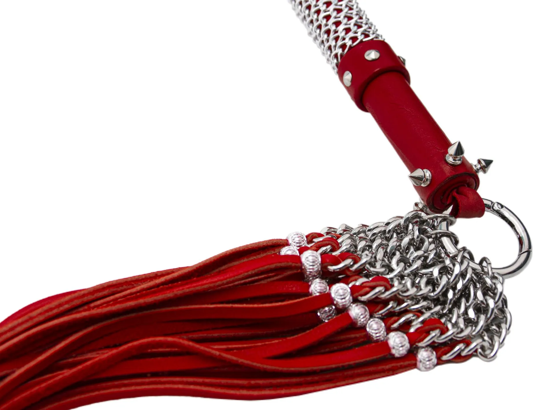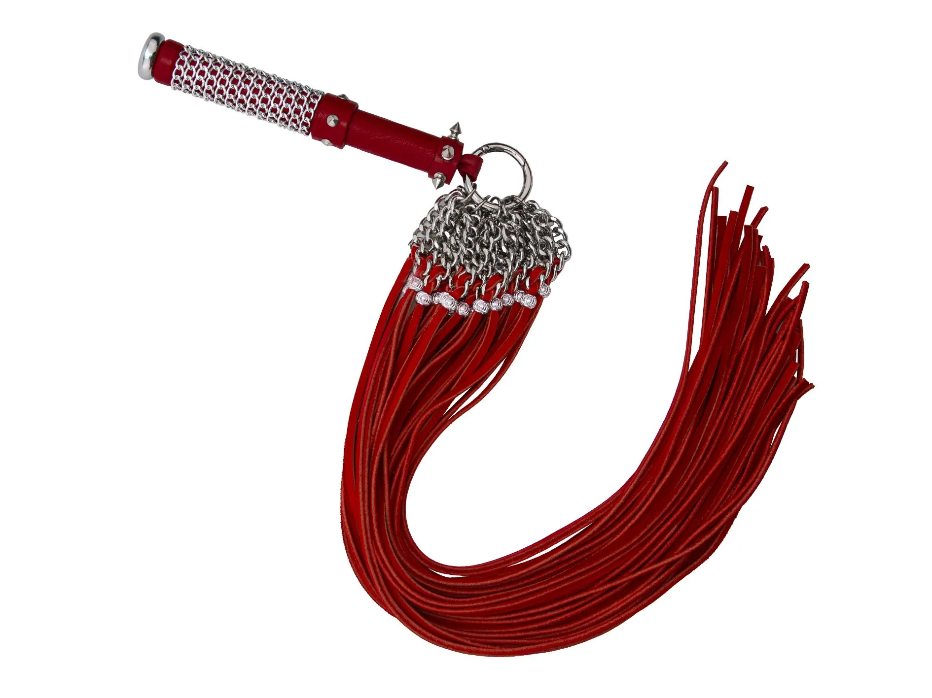 Флогер поворотно-вращающийся ”Полный улёт”. (рукоять: в основании декоративное плоское метал. навершие, место хвата обвито цепочкой с алмазной гранью с 2-мя кожаными кольцевидными ограничителями – на верхнем 5 декор. метал. конусами – выше 5 декор. метал шипов – в торце усиленная петля с карабинным кольцом (D40мм/) для фиксации съемно-наборных пучков хвостов, прошнурованных через 6 секц. Цепи (4 шт.) с алмаз. гранью (3,5 мм) закрепленную на кольце (D22мм) для соединения с рукоятью и обеспечения подвижности при работе. Материал - натуральная кожа, металл.