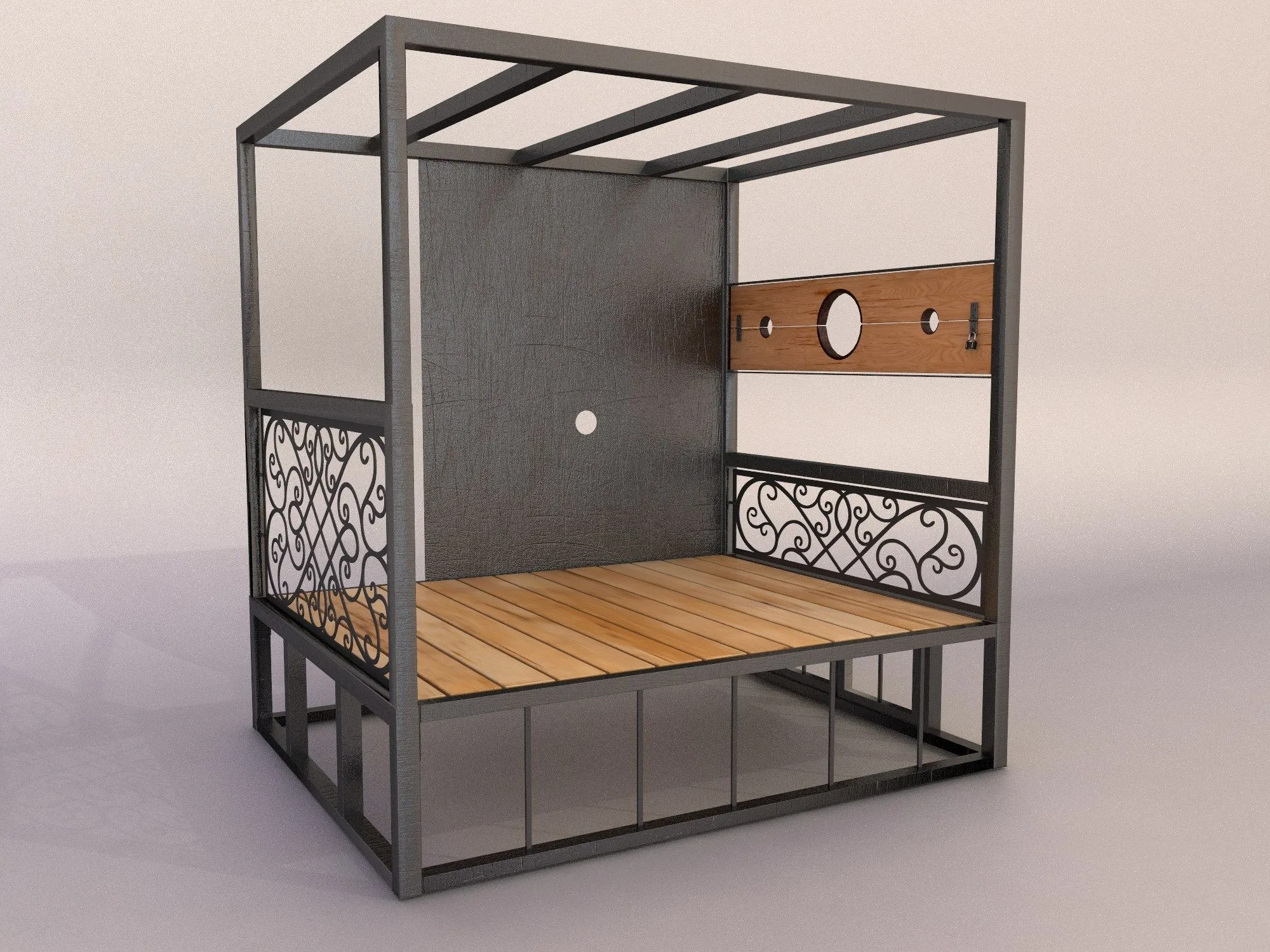 По функциональности данная кровать для БДСМ очень интересна и практична. Прочная конструкция позволяет практиковать связывания, подвешивание и другие подобные манипуляции. Варианты использования кровати расширяются, если в комплектации есть стена Glory hole. Украшена фигурной ковкой.