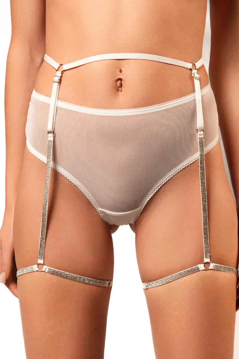 Трусики-бразилиана с завышенной посадкой из полупрозрачной сеточки создадут эффект прозрачности и невинности, а пояс с гартерами, украшенный кристаллами добавит игривости в ваш образ.