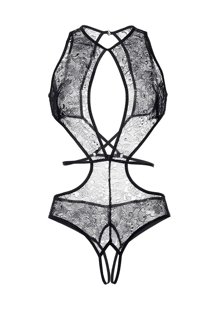 Эротическое боди Erolanta® Lydia из плотного кружевного полотна, с фигурным декольте. Застежка на шее. Открытая спинка. Перекрещивающиеся бретели соединены с регулируемым поясом. *Допускается замена кружева на аналогичное. Ростовка изделия 162-164 см. Как надеть? Начните с нижней части боди: надевайте также, как любые трусики; подтяните на бедра. После этого руки и голову аккуратно проденьте в поясок и верхнюю часть боди.