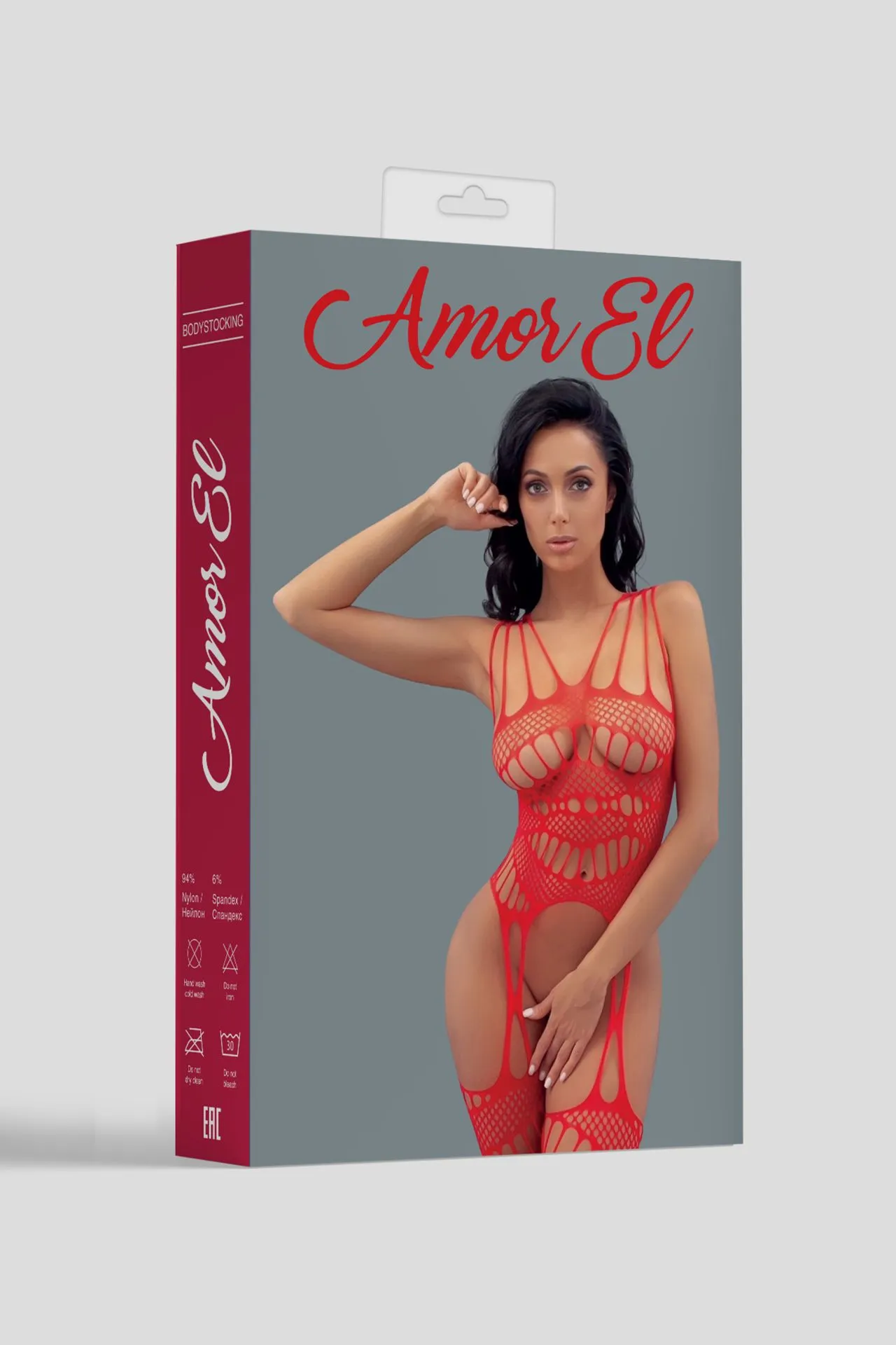 Сексуальный боди-комбинезон с бретельками и имитацией чулок. Дизайн в виде крупной сетки дополнен контрастными полупрозрачными линиями, подчеркивающими изгибы тела.