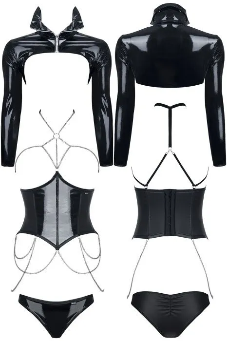 В комплект Artemis от Demoniq входят корсет под грудь с цепочками, короткий жакет и трусики. Эффектный и оригинальный комплект, подчеркнёт ваше доминирующее положение и изгибы фигуры. Цепочки на корсете изысканно и очень эротично подчеркивают вид обнаженной груди. Цепочки имеют 3 застежки, а на черных резинках есть регуляторы. Поэтому корсет легко снимается и надевается, а также просто регулируется по фигуре. Жакет полностью изготовлен из блестящей черной эластичной экокожи. Застегивается спереди на серебристую молнию с декоративной собачкой. В комплект Artemis также входят трусики, которые дополняют жакет и корсет. Передняя часть выполнена из черного глянцевого материала, задняя часть из матовой экокожи.