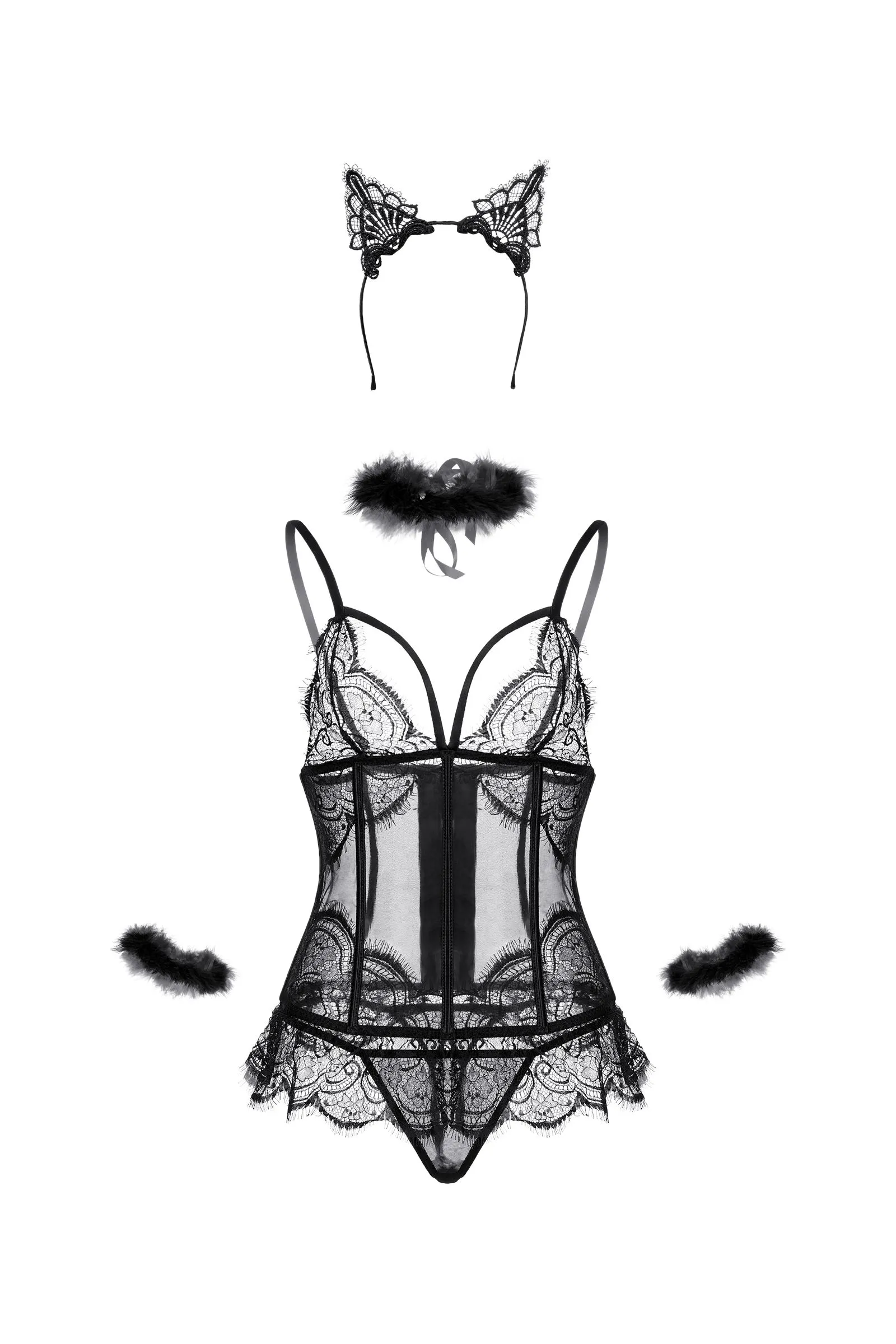 Прозрачный корсет Kati от Сandy Girl® с продольными косточками декорирован изящным кружевом. Глубокое декольте дополнено тонкими стрепами. Регулируемые бретели. Трехрядная застежка сзади. Металлический ободок с кружевными ушками, стринги из эластичной сетки, чокер и браслеты из пуха дополняют страстный образ.