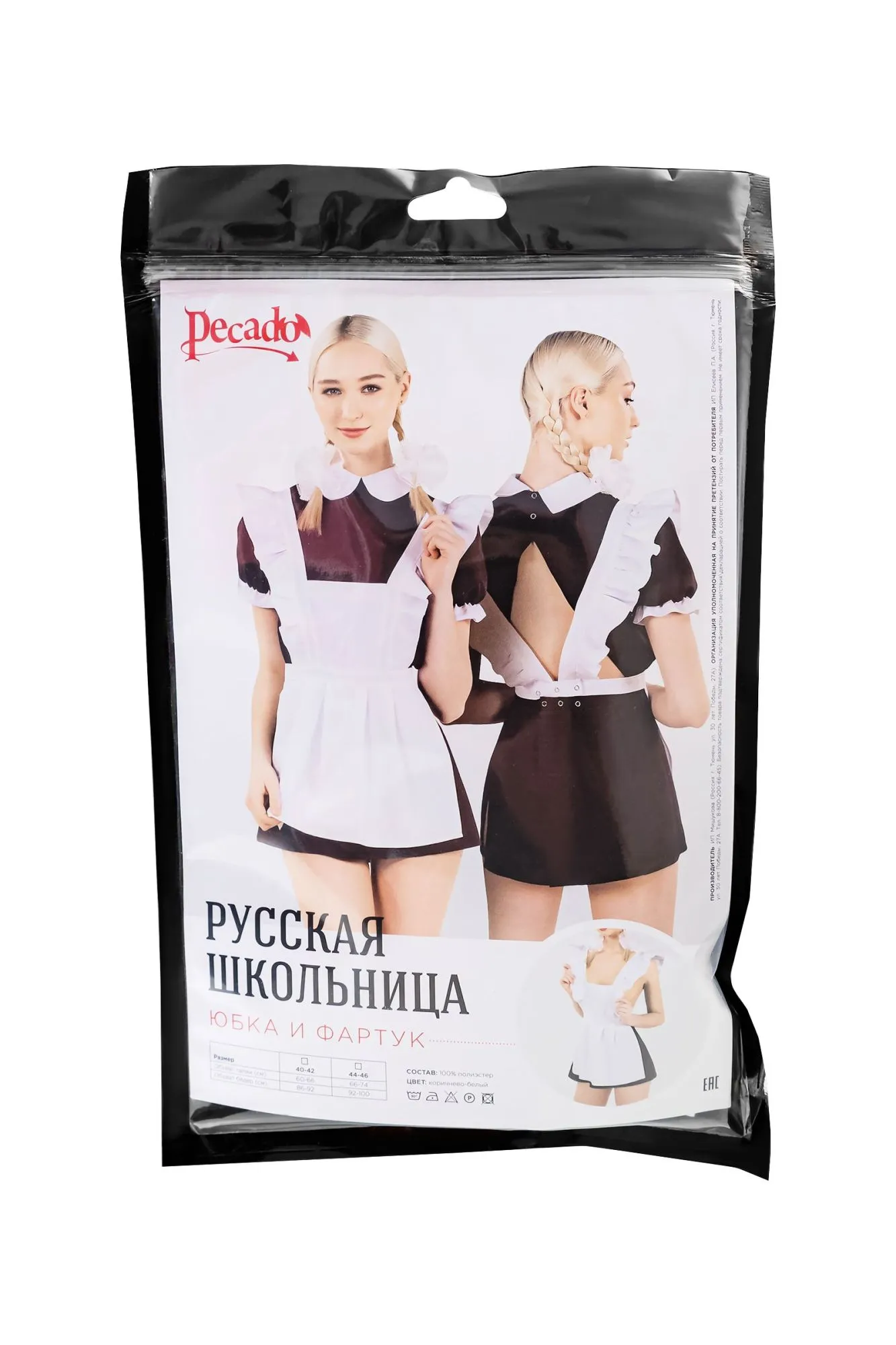 Нижняя и верхняя часть комплекта приобретаются отдельно. Именно так, Вы сможете подобрать оптимальный размер. Эротический костюм русской школьницы от Pecado создан для тех, кто желает испытать новые, будоражащие эмоции от ролевых игр. Нижняя часть комплекта представлена темной юбкой ультракороткой длины и белоснежным фартуком. Качественный материал отлично прилегает к телу, хорошо подходит к разным типам фигуры. Ткань нежная, отличается особой прочностью и не сковывает движения во время игр. Глубокие вырезы сексуально обнажают бедра, а при необходимости легко поднимаются, для быстрого доступа к разгоряченному телу. Благодаря возбуждающей длине юбки, партнер погрузится в море роковых фантазий при виде Вас в эротическом образе! ● Состав комплекта – юбка, фартук ● Материал – 100% полиэстер. ● Качественная фурнитура. ● Цвет юбки коричневый, цвет фартука - белый. ● Сделано в России. ● Размерный ряд 40-42, 44-46 (Соответствует Российской размерной сетке).