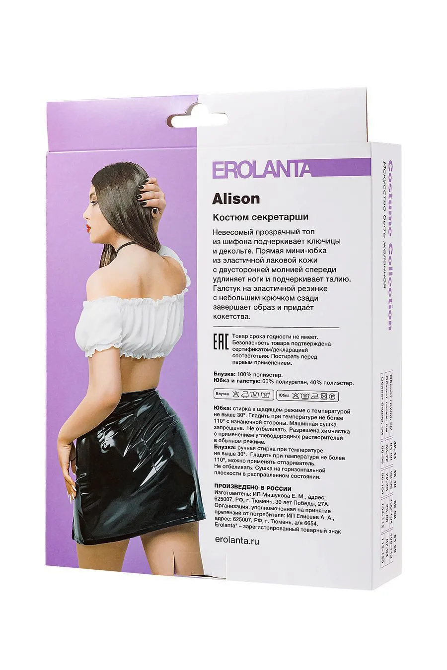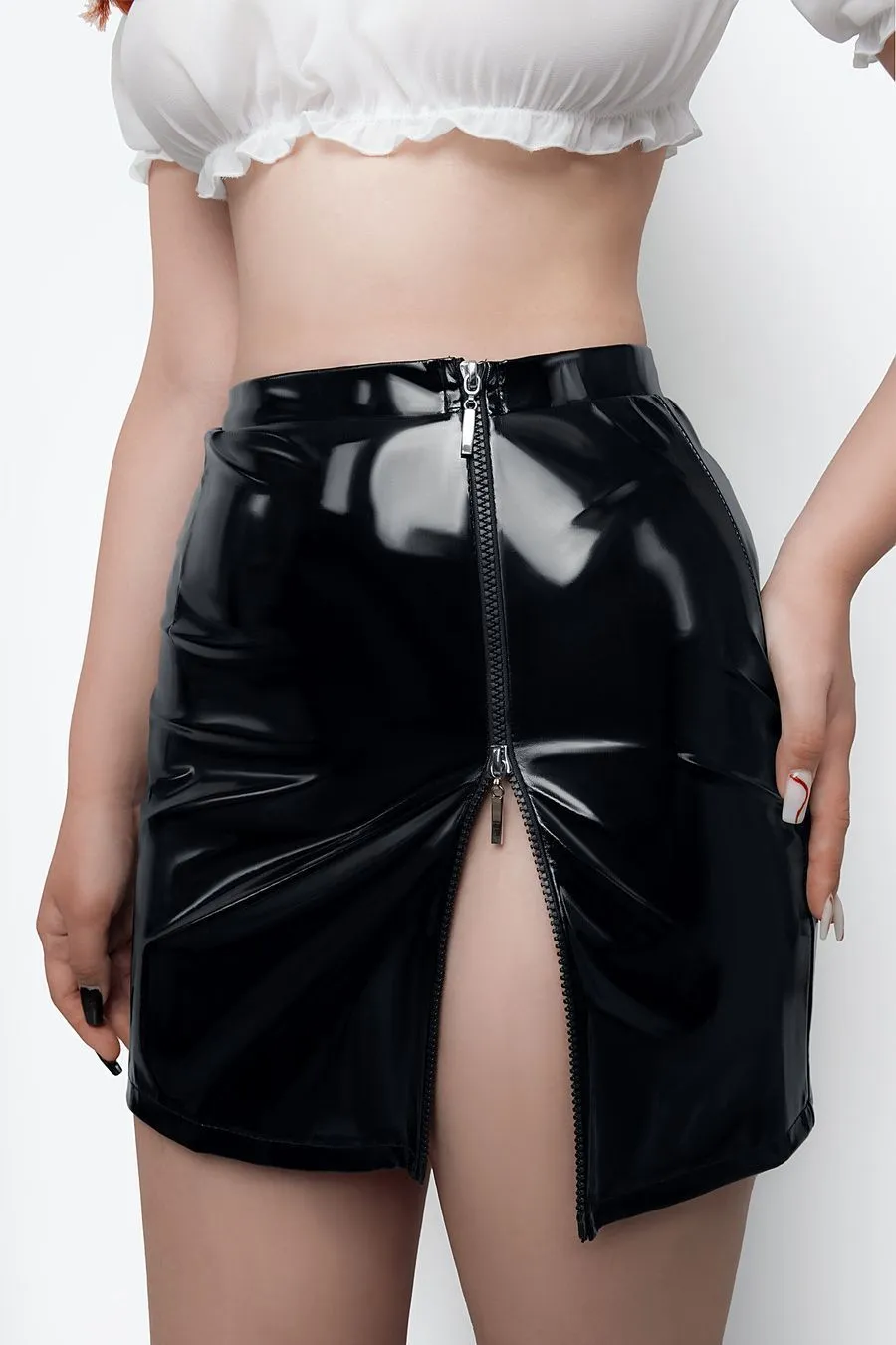 Прямая юбка из лаковой кожи скрывает животик, даёт небольшую коррекцию силуэта, подчеркивает талию и бедра. Двусторонняя молния спереди визуально удлиняет ноги и добавляет элемент игры - скинуть юбку можно в одно мгновение. Невесомый прозрачный топ из шифона придает груди соблазнительный объем, подчеркивает ключицы и декольте, не сковывает движений. Рукава-фонарики дают возможность прикрыть плечи или наоборот - добавить образу обнаженности. Галстук на эластичной резинке с небольшим крючком сзади завершает образ и придаёт кокетства.