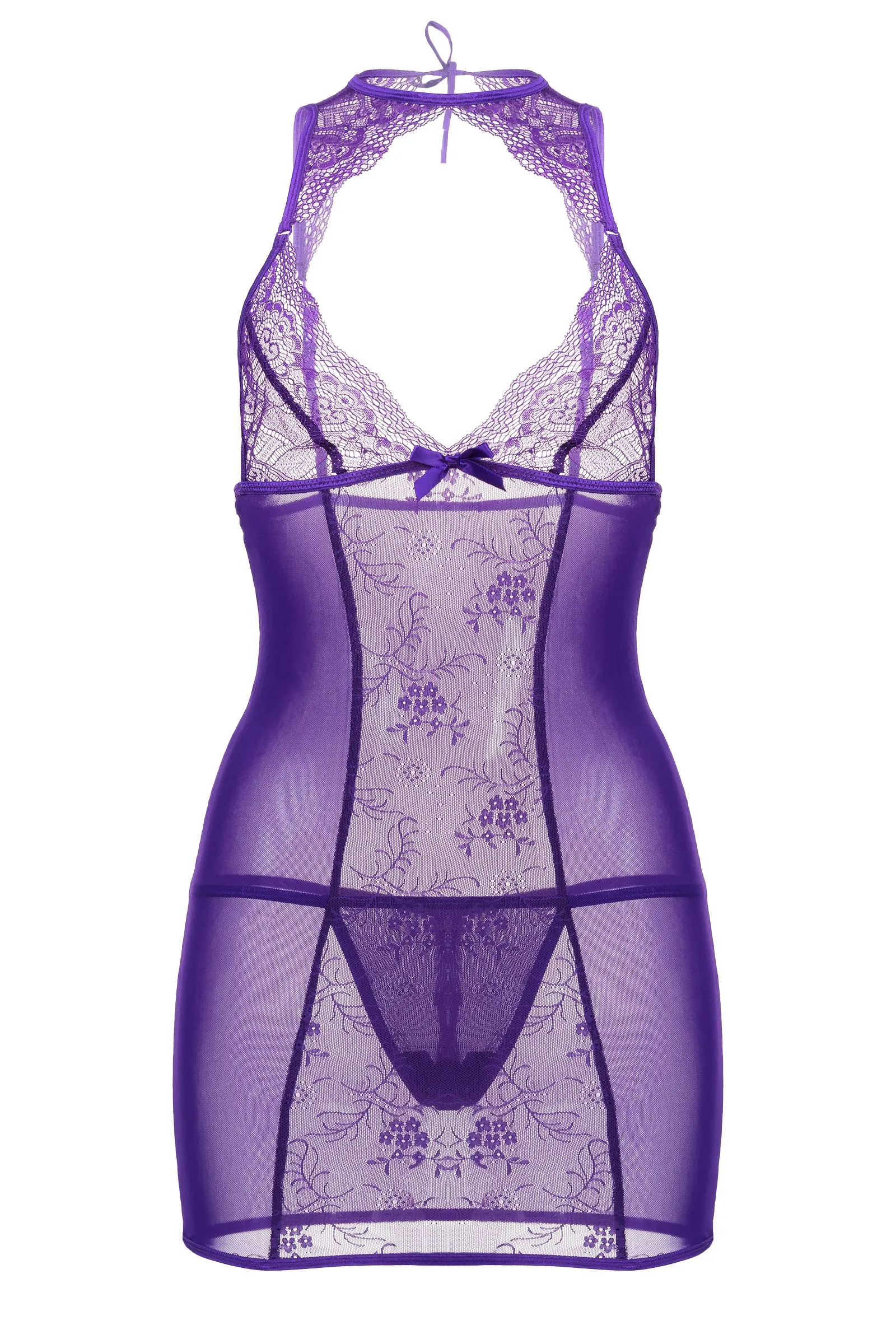 Все внимание на грудь! Кружевное фигурное декольте комбинации Candy Girl® Scarlett притягивает к себе все взгляды. Сатиновый бантик на уровне груди придает кокетства образу. Изящная кружевная спинка, регулируемые бретели и завязка на шее обеспечивают идеальную посадку лифа. Облегающий крой подчеркивает манящие изгибы силуэта. Вертикальные швы и комбинирование кружевных и сетчатых вставок визуально добавляют фигуре стройности. Эластичные ткани обеспечивают комфортное ношение. Т-стринги идеально завершают образ.