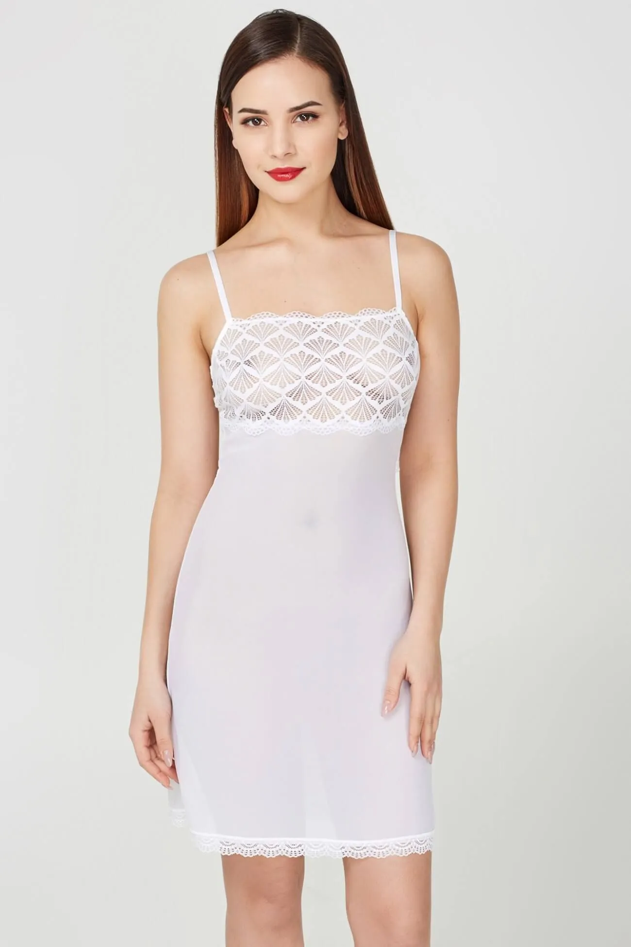 Элегантная ночная сорочка Arlana от бренда Infinity Lingerie изготовлена из белого полупрозрачного материала и декорирована легким кружевом в области бюста и по низу изделия. На спине у сорочки есть крупный вырез, благодаря которому Ваш образ будет казаться еще более откровенным и соблазнительным. Бретельки регулируемые, несъемные. Такой сексуальный, но в то же время комфортный наряд подойдет как для горячей ночи с любимым, так и для повседневного сна.