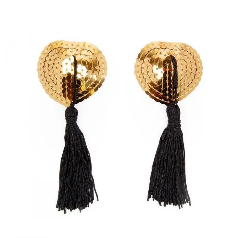 Золотые блестящие пестисы на грудь в форме сердечек с пайетками и кисточкой. Добавят изюминку в любовную игру, украсят соски, сделав грудь привлекательной и манящей. Внешняя сторона изделий отделана пайетками. На внутренней имеется специальный силиконовый слой, за счёт которого аксессуары держаться на сосках.