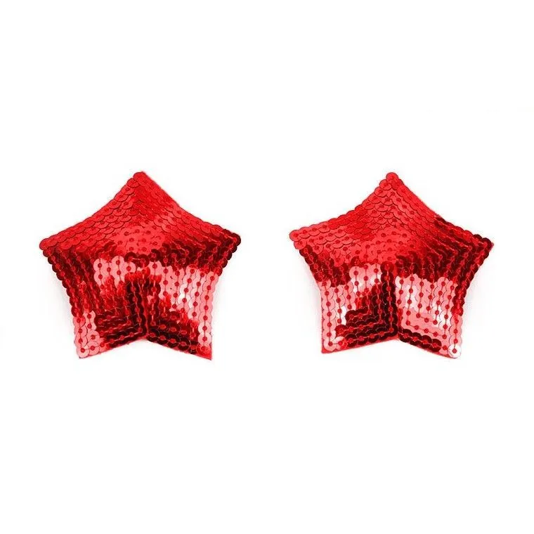 Красные блестящие пестисы на грудь в форме звёздочек с пайетками. Добавят изюминку в любовную игру, украсят соски, сделав грудь привлекательной и манящей. Внешняя сторона изделий отделана пайетками. На внутренней имеется специальный силиконовый слой, за счёт которого аксессуары держаться на сосках.