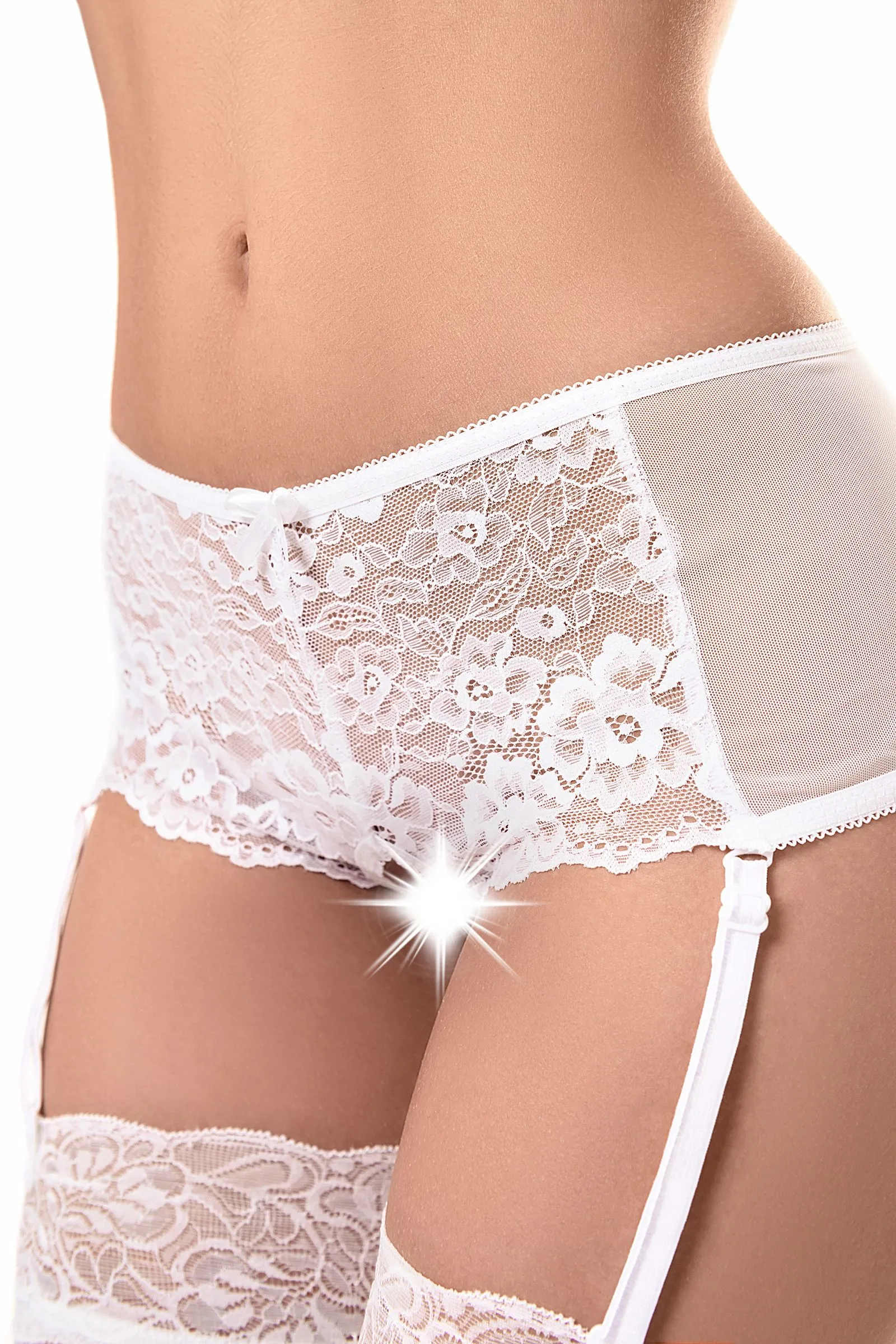 Эротические трусики-пояс Erolanta® Sheila, эластичные, из стрейч-сетки со сложными кружевными вставками, с вырезом сзади, без боковых швов, с атласными бантиками. Съемные регулируемые пажи. *Допускается замена кружева на аналогичное. Чулки в комплект не входят. На видео трусики Erolanta® Sheila дополнены идеально сочетающимся бралетт Erolanta® Nelly.