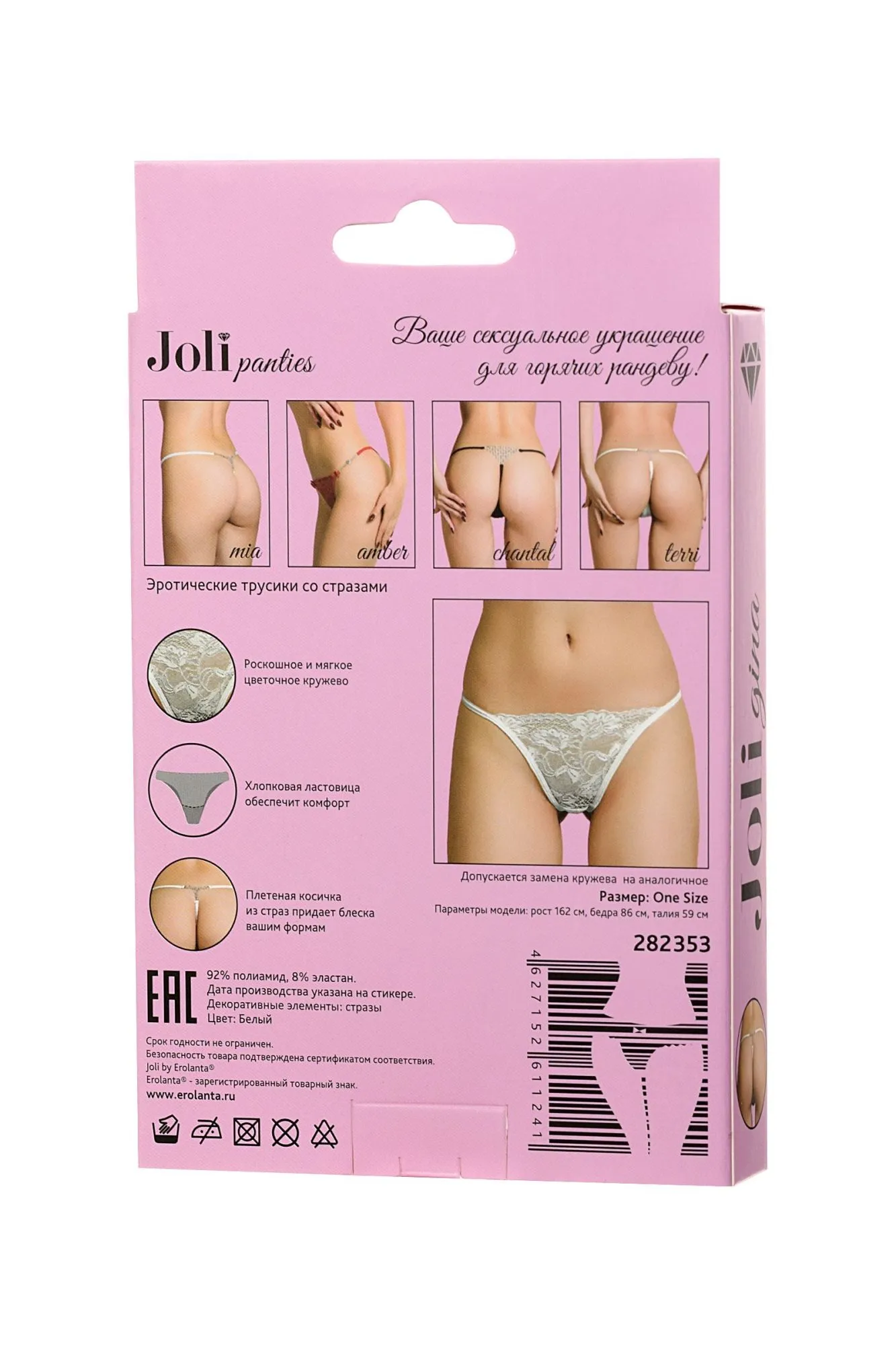 Joli panties – ваше сексуальное украшение для горячих рандеву! Новая линейка романтичного белья Joli (в пер. с французского красивая) радует глаз элегантными деталями и нежными материалами европейского качества. Изящное кружево с цветочным орнаментом спереди. Плетеная косичка из страз у основания ягодиц придает сексуальному образу блеска и яркости. Joli panties – выбери украшение для обольщения!